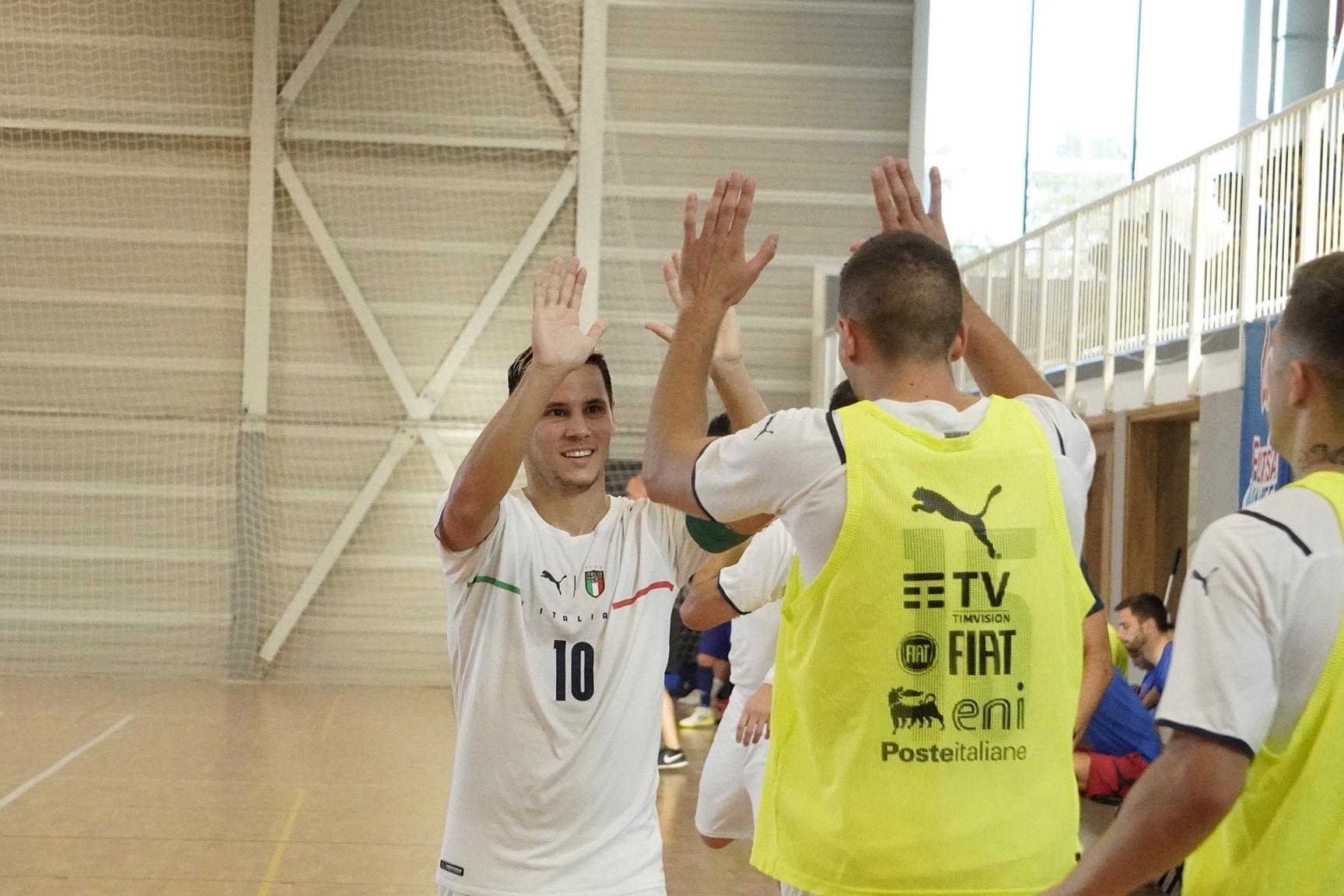La partita. La Finlandia conferma di essere una squadra molto aggressiva, mettendo gli Azzurri in difficoltà dal punto di vista fisico e raggiungendo quota tre falli dopo appena tre minuti dal calcio d’inizio. Nonostante il predominio del gioco da parte dell’Italia, sono gli Scandinavi però ad avere la più grande occasione per sbloccare il confronto alla metà esatta della prima frazione, ma un triplo miracolo di Miarelli in rapida sequenza evita la marcatura dei ragazzi di Mico Martic; in particolare è prodigioso l’ultimo intervento con un salvataggio proprio sulla linea. Al 13’ l’episodio che sblocca il confronto: Kangas avanza palla al piede nella metà campo azzurra, ma la sua conclusione viene intercettata da Merlim, bravo e preciso a trovare quindi il pallonetto vincente dalla distanza con la porta sguarnita. Quando sul cronometro mancano poco meno di 5 minuti all’intervallo, il doppio cartellino giallo rimediato da Murilo costringe l’Italia all’inferiorità numerica. Nei due minuti in 4 contro 5 la difesa azzurra è coriacea e puntuale, e viene salvata anche dal palo sul siluro di Autio, consentendo così agli Azzurri – guidati anche quest’oggi in panchina da Vanni Pedrini al posto del Ct Bellarte – di tornare negli spogliatoi sull’1-0 di vantaggio.