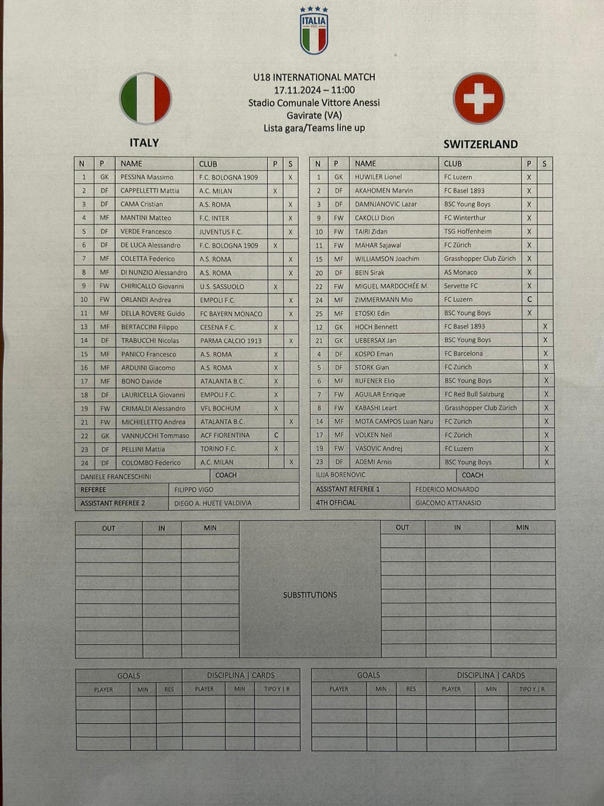 Altra grande prestazione di carattere per la Nazionale Under 18, che ha vinto 1-0 contro i pari età della Svizzera a Gavirate, bissando il successo per 2-1 ottenuto tre giorni fa a Novarello. A decidere l'incontro in favore degli Azzurrini, che ieri hanno reso omaggio al ricordo di Gigi Riva a Leggiuno, è stata una rete siglata a pochi secondi dal termine (45'+4st) da Alessandro Di Nunzio, centrocampista della Roma.