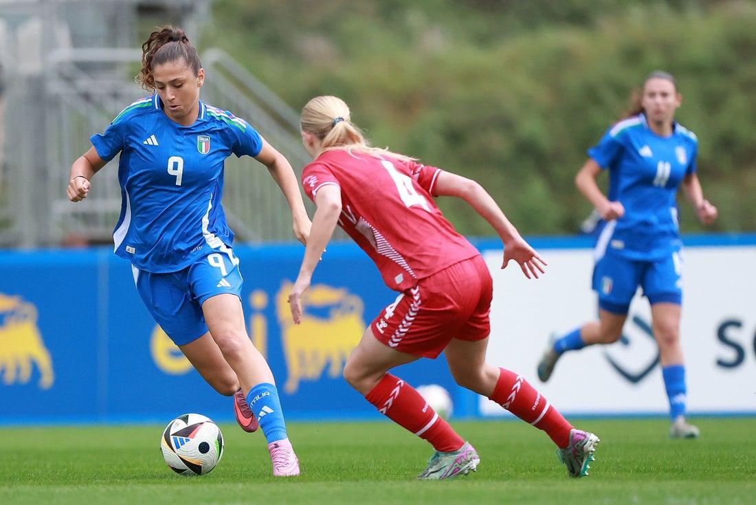 LA PARTITA. Vento e pioggia sono due ospiti indesiderati al CPO di Tirrenia, dove complici le condizioni climatiche proibitive la partita stenta a decollare. Al quarto d’ora ci prova Eleonora Ferraresi, ma la sua conclusione dalla distanza termina sul fondo. E al 21’ l’arbitro Manduzio è costretto a sospendere il match per maltempo, con le due squadre che rientrano negli spogliatoi. Dopo uno stop di una ventina di minuti spunta finalmente il sole ed è la Danimarca a sfiorare il vantaggio, ma il destro dalla distanza di Lund si stampa sul palo. Ci prova ancora Ferraresi, che servita da Cherubini non inquadra lo specchio. Sul fronte opposto Holt su punizione impegna Mazzocchi, poi Rathe di testa manda da pochi passi a lato. A inizio ripresa è ancora decisiva Giulia Mazzocchi, miracolosa due volte sulla solita Lund. L’Italia risponde con Vitale, che non centra la porta dall’altezza del dischetto. Ci pensa Rosanna Ventriglia a sbloccare il match al 73’, finalizzando al meglio una bella azione corale. Pregevole il gol dell’attaccante della Roma, che raccoglie il cross di Tosello e con un controllo a seguire si libera della marcatura di Colstrup per poi scaricare un violento destro in rete.