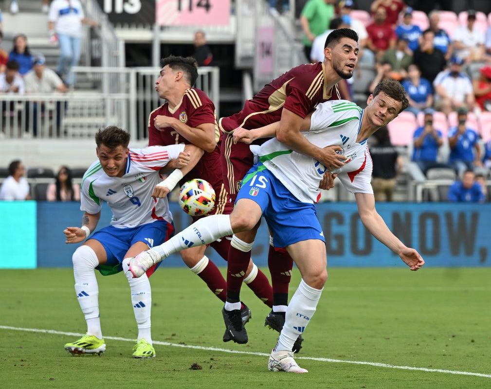 Il Venezuela si conferma squadra forte fisicamente e con buone individualità, non è facile imporsi sul piano del ritmo. Sulle fasce sia Udogie che Cambiaso non riescono ad arrivare sul fondo, mentre Locatelli si abbassa tra i due centrali di difesa e Di Lorenzo o Scalvini cercano di farsi trovare sulla trequarti avversaria. Tanti movimenti, un calcio fluido, ma poche occasioni. Dal pressing alto dell’Italia nasce al 40’ il vantaggio firmato da Retegui, che approfitta del rinvio corto di Romo intercettato da Locatelli e con un preciso diagonale rasoterra firma l’1-0. Tre minuti più tardi però l’Italia restituisce il favore.