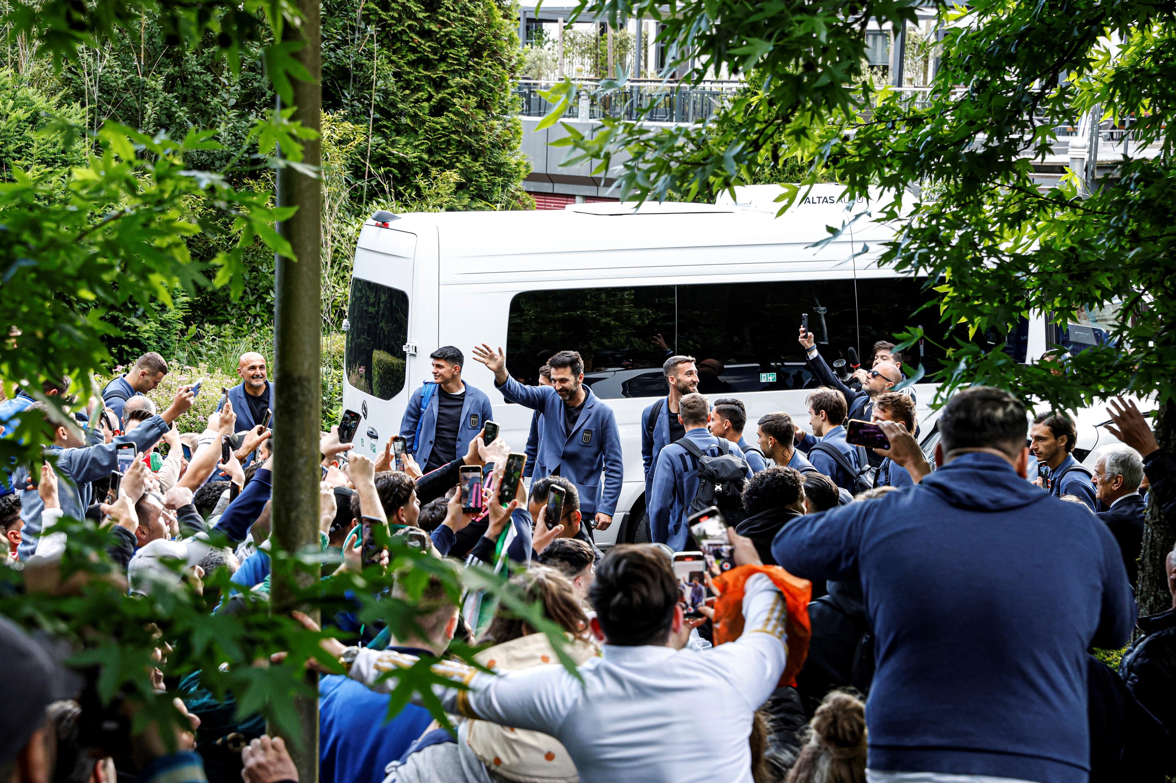 Già a Dortmund, gli Azzurri hanno ricevuto una calda accoglienza da un centinaio di tifosi italiani (con tanto di bandiere tricolori, con altri tifosi attaccati alle vetrate del terminal per immortalare il momento dello sbarco) e dai vertici delle istituzioni locali: il sindaco di Dortmund Thomas Westphal, la responsabile dell’Ufficio del Sindaco Alexandra Kogelheide, il vice presidente della German Football Association Peter Frymuth, il presidente dell’Associazione Calcio e Atletica della Westfalia Manfred Schnieders e Martin Sauer, Host City Project Lead EURO 2024, hanno dato il benvenuto a calciatori e staff, intrattenendosi per qualche minuto con il presidente della FIGC Gabriele Gravina (che ha donato una maglia al Sindaco con il suo cognome, Westphal, e il numero 24, a simboleggiare l’anno dell’Europeo), il Ct Luciano Spalletti, il capo delegazione Gianluigi Buffon e il capitano Gianluigi Donnarumma.