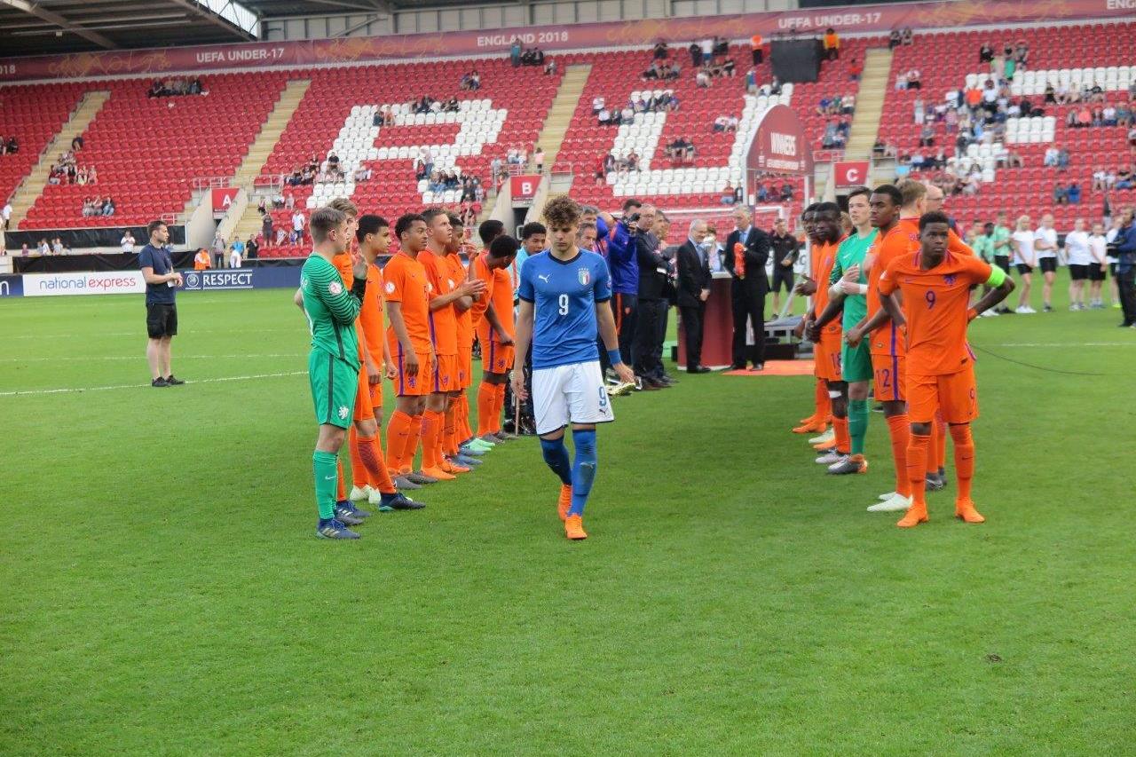 Gli Azzurrini scendono in campo con Russo in porta, in difesa Barazzetta, Armini, Iwern, Brogni, a centrocampo Gyabuaa, Leone, Ricci, in attacco Greco con il capocannoniere Vergani e Riccardi. L’avvio è di marca olandese, quindici minuti di alto livello con tre occasioni: la prima al 10’, ma fortunatamente Mamengi colpisce male, la seconda al 14’ con un destro a giro di Gravenberch che si stampa sulla traversa. Un minuto dopo ancora l’olandese da buona posizioni, ma il tiro è centrale e Russo non ha difficoltà a parare.