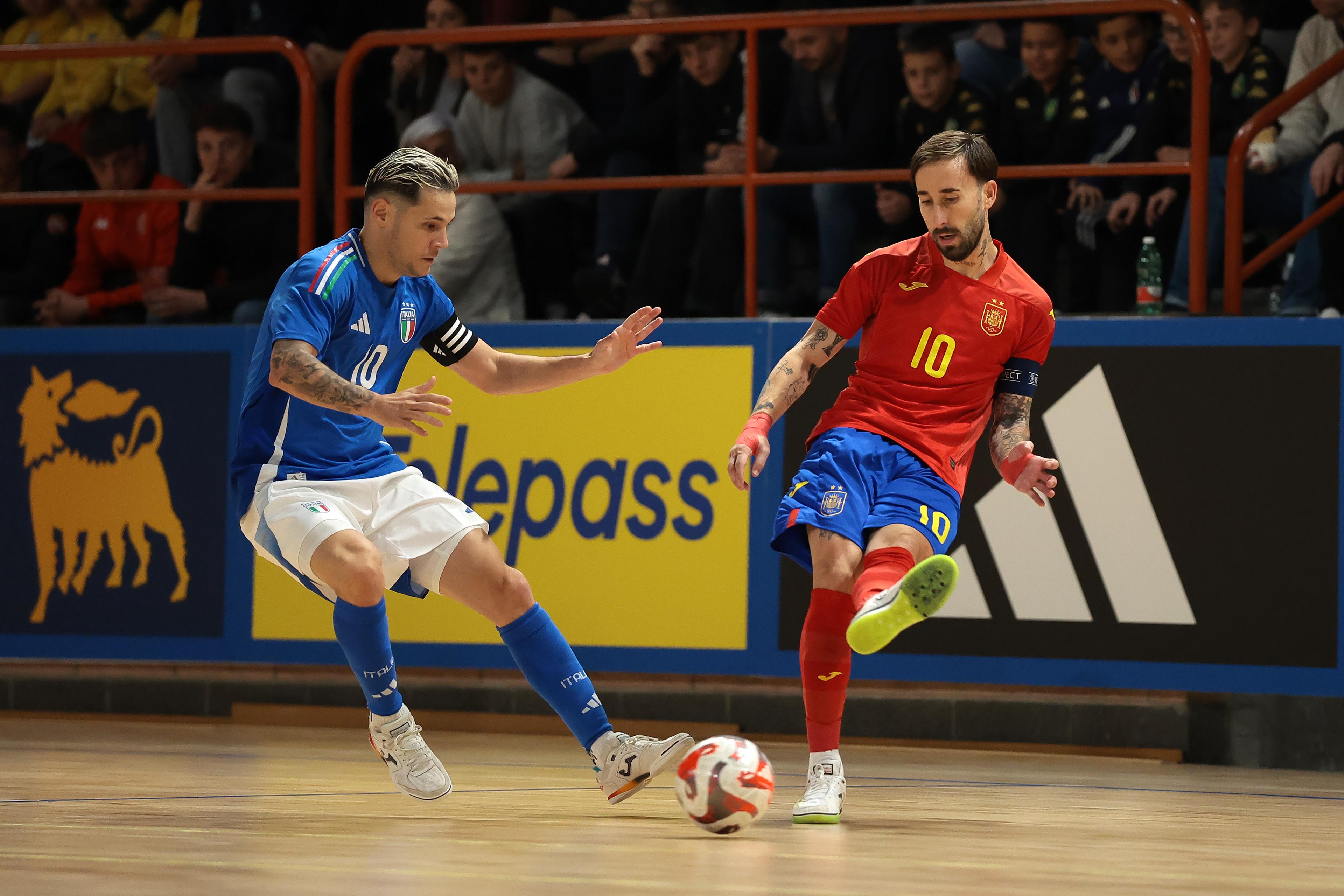 LA PARTITA. Samperi sceglie Bellobuono fra i pali, con un quintetto completato da Pulvirenti, Liberti, Merlim e Rossetti, mentre la Spagna risponde con Herrero in porta, Raya, Rivillios, Cecilio e la stella del Barcellona Adolfo. L’intensità è subito altissima ma al minuto 8 l’Italia la sblocca con Motta nel momento di massima pressione spagnola: conclusione di prima a seguito di rimessa laterale e palla che supera Jesus Herrero per l’1-0. Immediatamente dopo gli Azzurri hanno una super chance per il raddoppio, ma il portiere dell’Inter Movistar compie due super interventi ravvicinati, prima su Liberti e poi sul tap-in di Pulvirenti. La Spagna è però spietata e al 10’ trova l’immediato pareggio con Pablo Munoz, bravo nel capitalizzare una ripartenza. Il match resta molto equilibrato, poi al 15’ la Spagna recupera una palla alta in pressione e Cecilio calcia a porta vuota vedendosi negata la gioia del gol da un autentico miracolo di Bellobuono. La risposta degli Azzurri arriva un giro di lancette dopo e a seguito del time-out chiamato da Samperi: Rossetti si libera bene in fascia destra e, dopo aver messo un pallone teso sul secondo palo, è Pulvirenti ad arrivare scomposto sul secondo palo deviando sul fondo.