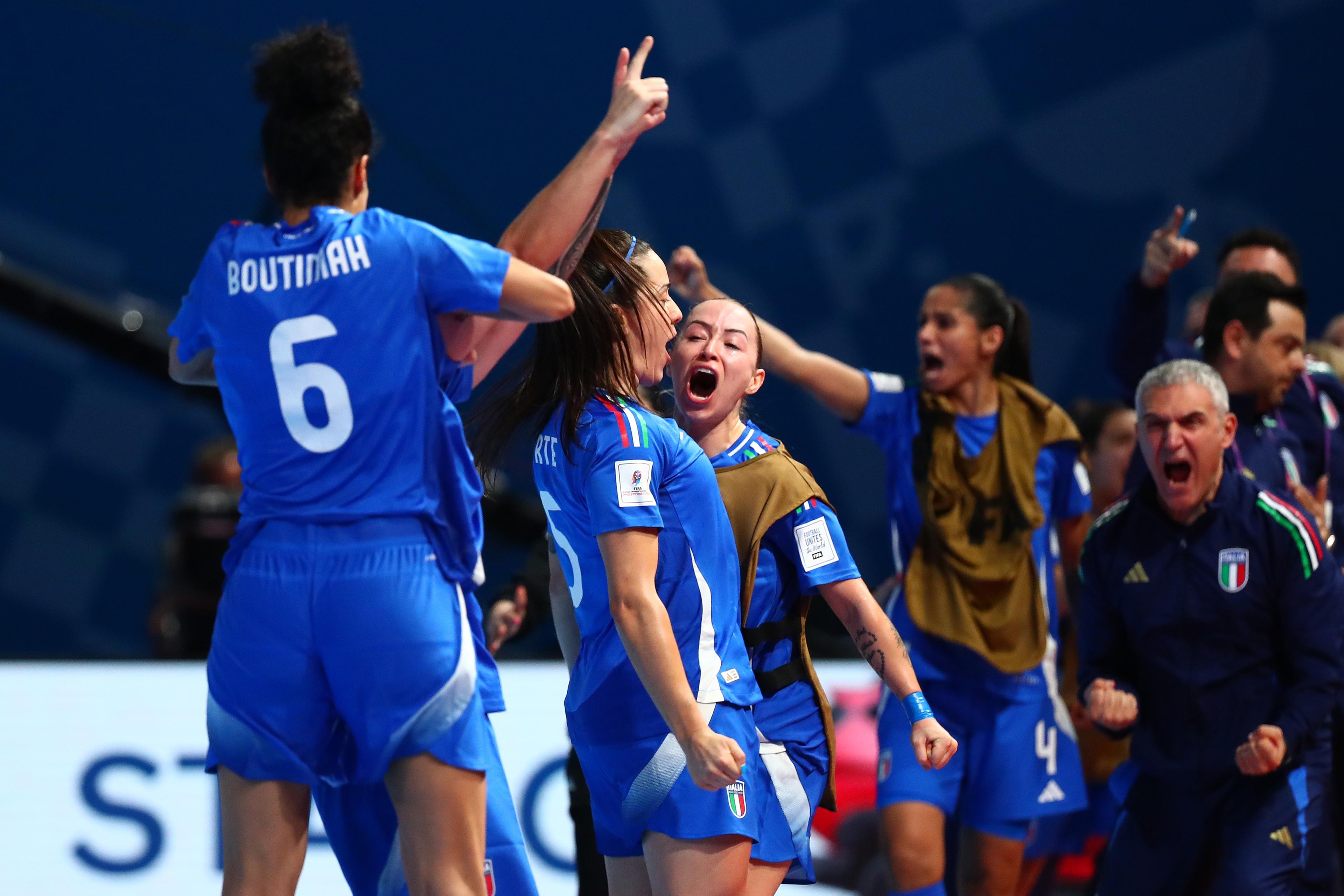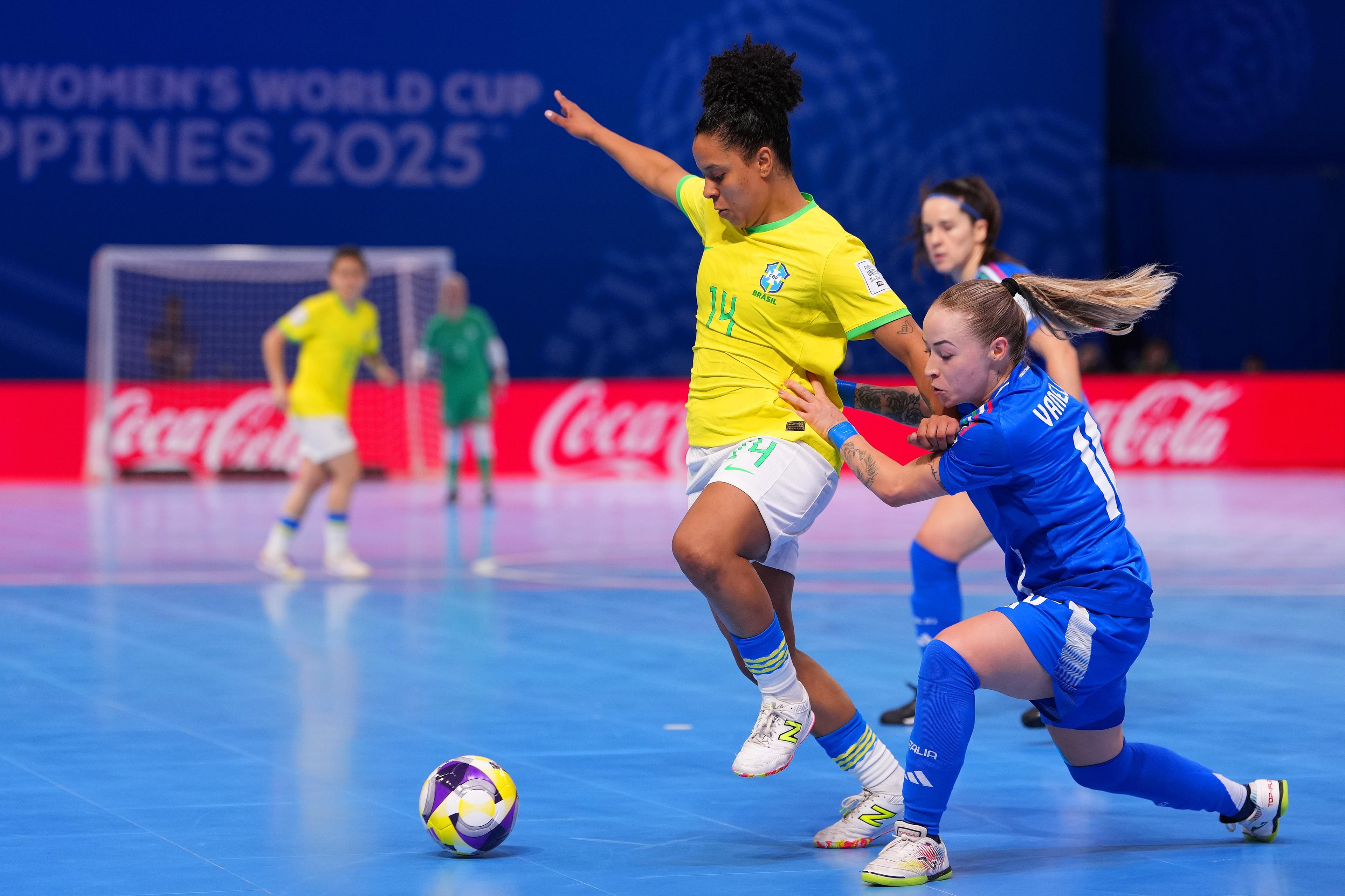 LA PARTITA. Il quintetto scelto dall’Italia è sempre lo stesso, con Sestari in porta e le quattro di movimento Borges, Coppari, Adamatti e Boutimah. L’inizio è choc, perché alla prima palla rubata a metà campo il Brasile vola in ripartenza e con l’uno-due fra Ana Luiza e Amandinha confeziona l’1-0 dopo appena 31 secondi di partita. La rete di Ana Luiza ‘chiama’ la risposta azzurra, ma è la Seleçao al 3’ a divorarsi il raddoppio con Emilly: l’ultimo pallone d’oro salta secco Coppari al limite dell’area ma calcia clamorosamente fuori tutta sola davanti a Sestari. Il primo tiro dell’Italia arriva al 6’ con Boutimah: sul destro della miglior marcatrice della storia della Nazionale (53 reti in 55 partite) è però attenta Bianca Castagnaro, il portiere verdeoro per molti anni protagonista della nostra Serie A. Nella super sfida a distanza fra estremi difensori si fa trovare pronta anche Sestari che devia in angolo una ‘sventola’ di Luana. Le Azzurre pareggiano al 7’: sugli sviluppi di un corner Adamatti calcia sporco, Boutimah fa un velo che inganna Bianca e la palla si insacca per l’1-1.