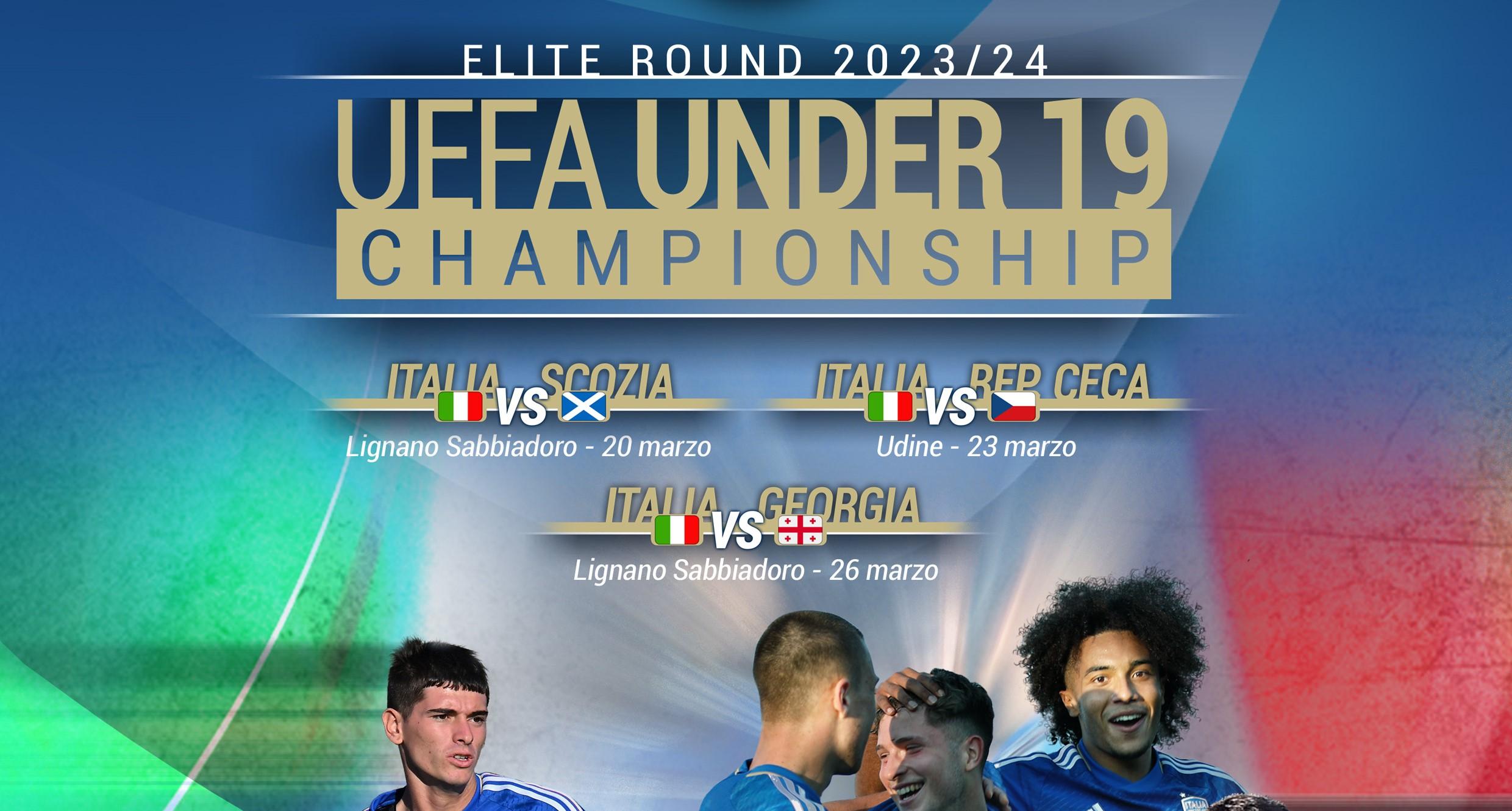 NAZIONALE UNDER 19 Da mercoledì 20 a martedì 26, invece, appuntamento decisivo per la qualificazione all'Europeo per la Nazionale Under 19 guidata da Bernardo Corradi: gli Azzurrini, campioni d'Europa di categoria in carica, giocheranno la fase élite in Friuli-Venezia Giulia e un girone che comprende anche Scozia, Cechia e Georgia. Italia in campo mercoledì 20 e martedì 26 a Lignano Sabbiadoro rispettivamente contro scozzesi e georgiani; sabato 23 il match contro i cechi a Udine. In palio, un solo posto per la fase finale in programma a luglio in Irlanda.