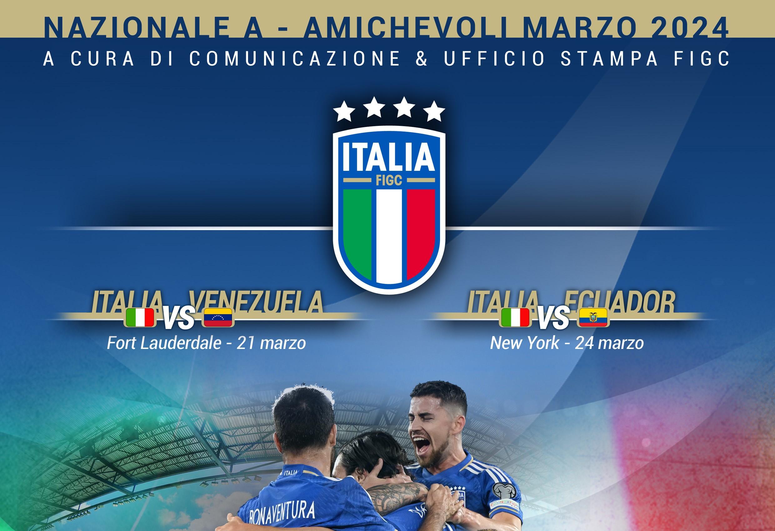 NAZIONALE A La Nazionale A partirà domani alla volta degli Stati Uniti, dove disputerà le prime due amichevoli del 2024 a poco più di tre mesi dall’appuntamento con la fase finale del Campionato Europeo: giovedì 21 marzo (ore 22 italiane, 17 locali – diretta su Rai 1) al 'Chase Stadium' di Fort Lauderdale, casa dell’Inter Miami, gli Azzurri affronteranno il Venezuela, mentre domenica 24 marzo (ore 21 italiane, 16 locali – diretta su Rai 1) se la vedranno con l’Ecuador alla Red Bull Arena, nell’area di New York, a Harrison in New Jersey.