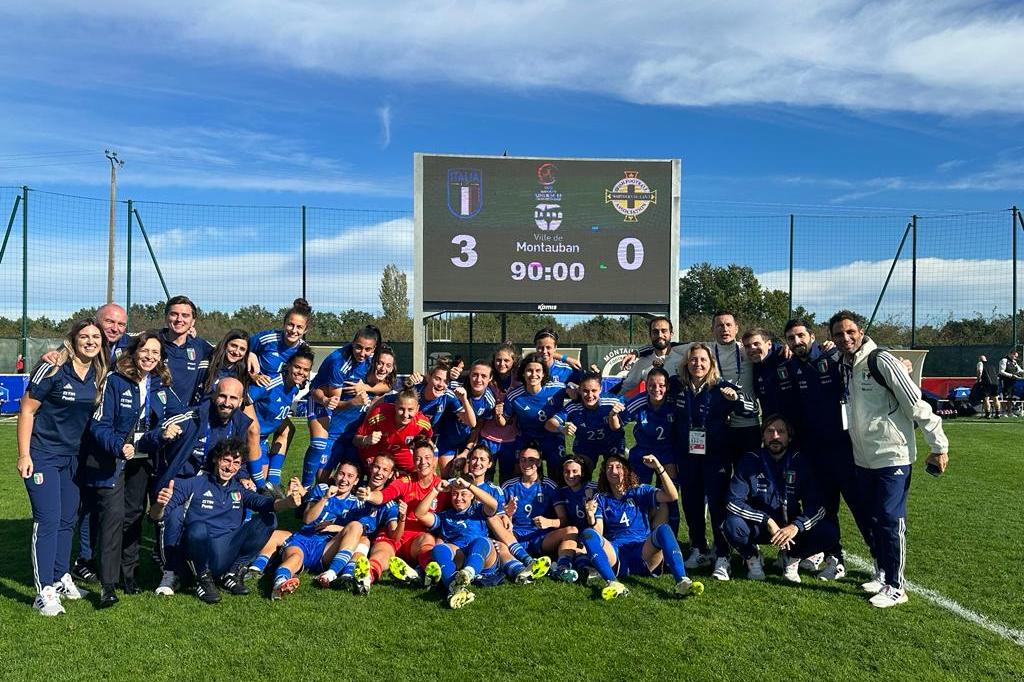 Con una giornata d'anticipo, la Nazionale Under 19 Femminile è già sicura di un posto nella seconda fase di qualificazione all'Europeo. Dopo l'Ungheria, le Azzurrine hanno battuto anche l'Irlanda del Nord (3-0) a Montauban (Francia) grazie alla doppietta di Giada Pellegrino Cimò (Roma) e alla rete nel finale di Valentina Donolato (Milan). Con il biglietto per il Round 2 già in tasca, l'Italia martedì a Colomiers si giocherà il primato contro le padrone di casa, anche loro a punteggio pieno ma con una differenza reti migliore (+5 contro +4). Un risultato, quello dell'Under 19, che si aggiunge a quello già raggiunto due settimane fa dall'Under 17: a dicembre, nelle urne del sorteggio della seconda fase che si giocherà a marzo, ci saranno quindi entrambe le Nazionali giovanili femminili azzurre.