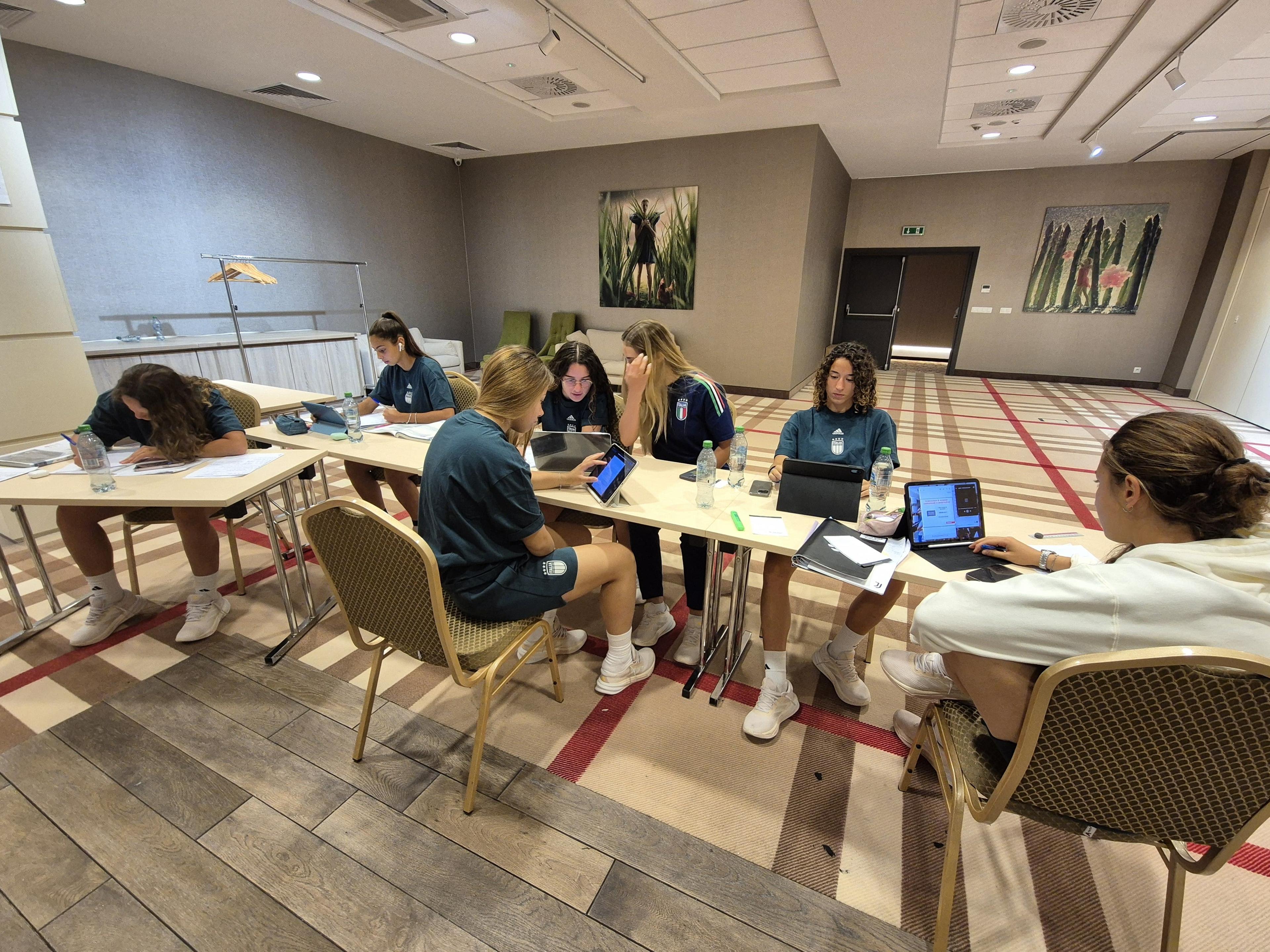 STUDIO E CALCIO Le ragazze, in questi giorni, si dividono tra campo e libri, anche alla presenza della tutor scolastica Mariaceleste Basile, presente a Rszezow vista la collaborazione tra la FIGC e l'Università degli Studi Roma Foro Italico (responsabile Stefano Presciutti): se il pomeriggio è dedicato all'allenamento, la mattina le Azzurrine camminano per i corridoi con libri e tablet in mano, fino ad arrivare nella sala meeting dell'hotel che ospita il ritiro della squadra. Nella stessa stanza dove l'allenatore Nicola Matteucci e il suo staff danno le indicazioni tecnico-tattiche, c'è una fila di banchi dove si studia e ci si prepara. Economia aziendale, letteratura straniera, storia e filosofia e tanto altro. Perché l'estate delle Under 19 non finirà in Polonia: al rientro in Italia, tutte le calciatrici dovranno sostenere l'esame di maturità.