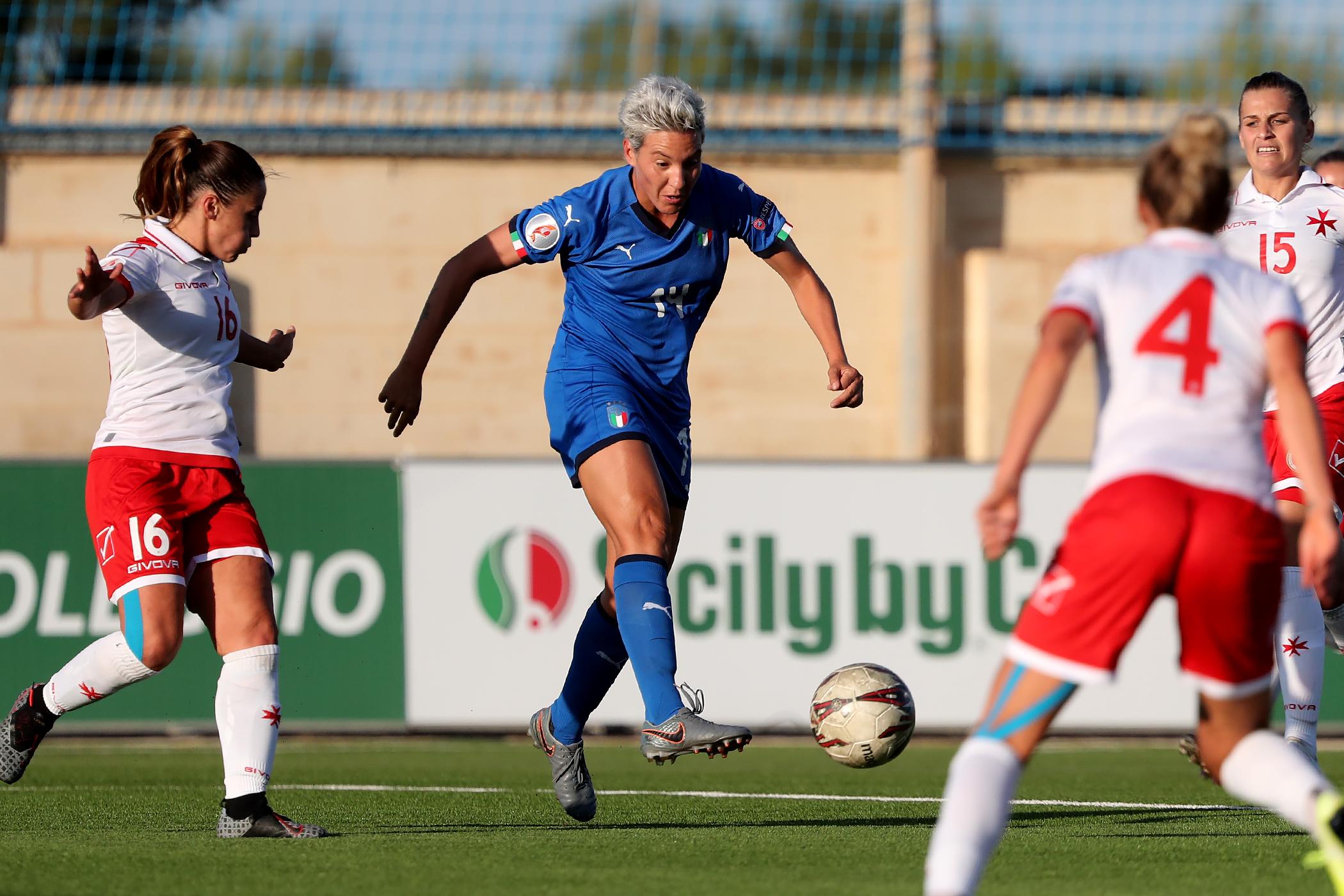 Per i secondi 45’ Milena Bertolini manda in campo Girelli al posto di Marinelli, Malta continua a difendersi e al 48’ sventa un’azione da gol creata da Giugliano, brava a farsi trovare libera in area ma imprecisa nell’ultimo passaggio per Giacinti, anticipata sul più bello dalle centrali avversarie. Al 58’ Bartoli con un po’ di fortuna trova libera in area Tarenzi, ma il destro dell’attaccante è debole e finisce tra le braccia del portiere maltese, che si ripete poco dopo su un colpo di testa da distanza ravvicinata di Bergamaschi. Entra anche Rosucci per Tarenzi, un cambio che rinforza il centrocampo azzurro permettendo alla squadra di palleggiare con più velocità. L’Italia a questo punto alza il pressing e trova il vantaggio al 68’ grazie a Elisa Bartoli, bravissima a sfruttare un assist di tacco di Girelli e a battere Xuereb con un destro dal limite dell’area. L’autrice del gol a dieci minuti dalla fine lascia il posto ad Alia Guagni, le occasioni da gol continuano ad arrivare e a tempo scaduto le Azzurre trovano anche il raddoppio. Fallo di mano di Lipman, Girelli dal dischetto spiazza il portiere avversario trascinando così le sue compagne al terzo successo di fila.