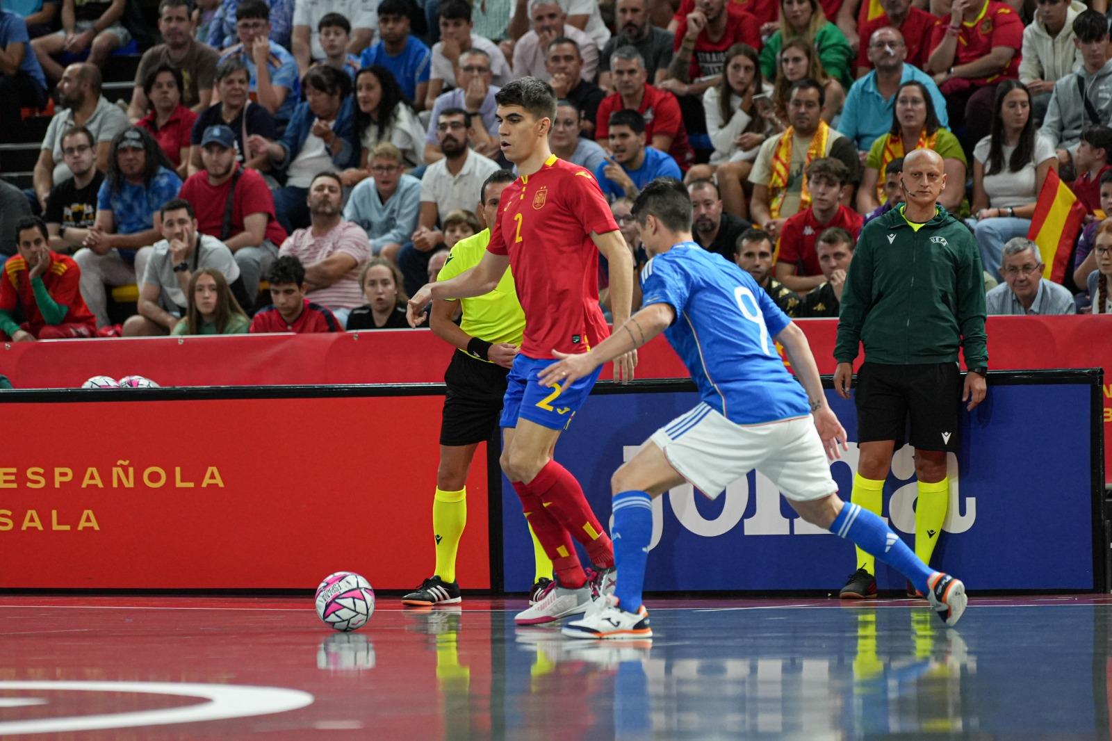 La partita. Primi minuti di grande equilibrio, con l’Italia che approccia bene e si rende pericolosa con un vivace Donin; la Spagna non sta a guardare e al 4’ arriva il destro di Adolfo ben sventato in angolo da Pietrangelo. Al 10’ si rifanno vivi gli Azzurri, due volte con Musumeci: il capitano impegna severamente Didac, portiere degli spagnoli, prima con un tiro ravvicinato, poi con una bella volée sempre sventata dall’estremo difensore del Barcellona. Il botta e risposta è immediato: è Adolfo a sprecare la più grande chance delle Furie Rosse, calciando alto solo davanti a Pietrangelo. È ancora Italia al 14’: la fantasia e l’uno contro uno in fascia di Isgrò illuminano la scena e il seguente mancino costringe Didac a un’altra grande parata. Il primo tempo si chiude a reti inviolate e nella ripresa la Spagna riparte forte, creando subito occasioni: nei primi 2’ sono Catela – due volte – e Boyis a impensierire Pietrangelo. Passata la sofferenza dei primi minuti, torna a farsi vedere l’Italia: è ancora una volta Isgrò ad accendersi in fascia, seminando due avversari e trovando, col destro, l’attenta risposta di Didac. Dall’altra parte del campo, anche Pietrangelo non è da meno del suo corrispettivo, sventando sul gran mancino di Chino. Al minuto 8 gli Azzurri vanno vicinissimi al vantaggio: un grande destro di Motta trova Musumeci sul secondo palo, ma il tiro è talmente forte che il capitano non riesce a coordinarsi e a due passi dalla riga di porta, devia alto sopra la traversa. Lo spavento carica la Spagna che va in rapida sequenza tre volte alla conclusione ma, fra i pali, Pietrangelo è straordinario in tutte le circostanze. Al 12’, al termine di un’azione convulsa, portata avanti dal duo Motta-Marcelinho, la palla schizza con una carambola baciando il palo interno a Didac battuto, ma senza trovare il bottino grosso. Nel finale, la squadra di Canillas attacca senza soluzione di continuità, Pietrangelo para l’impossibile e poi, a 4’ dalla fine Raul Campos trova la rete del vantaggio. Bellarte risponde subito col portiere di movimento e su un tiro di Merlim l’urlo per il possibile pareggio viene strozzato dal salvataggio sulla linea di porta di Raul Gomez.