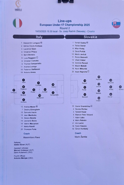 PARTITA. L'Italia scende in campo con il 4-3-1-2, con Luongo trequartista alle spalle della coppia d'attacco formata dal classe 2009 Arena e Campaniello, il miglior realizzatore del primo turno delle qualificazioni europee con 6 reti in 3 partite. La Slovacchia risponde con il 3-4-3, con il tridente offensivo composto da Pecsuk, Polťák e Baravelli, quest'ultimo acquistato appena un mese fa dal Pisa.