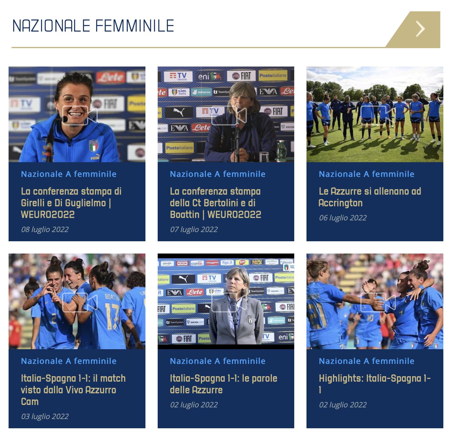 Una sezione speciale per seguire la Nazionale Femminile nel corso di UEFA Women’s EURO 2022, in programma in Inghilterra dal dal 6 al 31 luglio: news, approfondimenti, curiosità, statistiche, contenuti esclusivi, direttamente dal ritiro delle Azzurre a Blackburn, dove è previsto il quartier generale italiano, dagli stadi di Rotheram e Manchester e da Casa Azzurri, per la prima volta presente in una fase finale di un torneo femminile per accogliere i tifosi, i Media e gli sponsor della Nazionale.