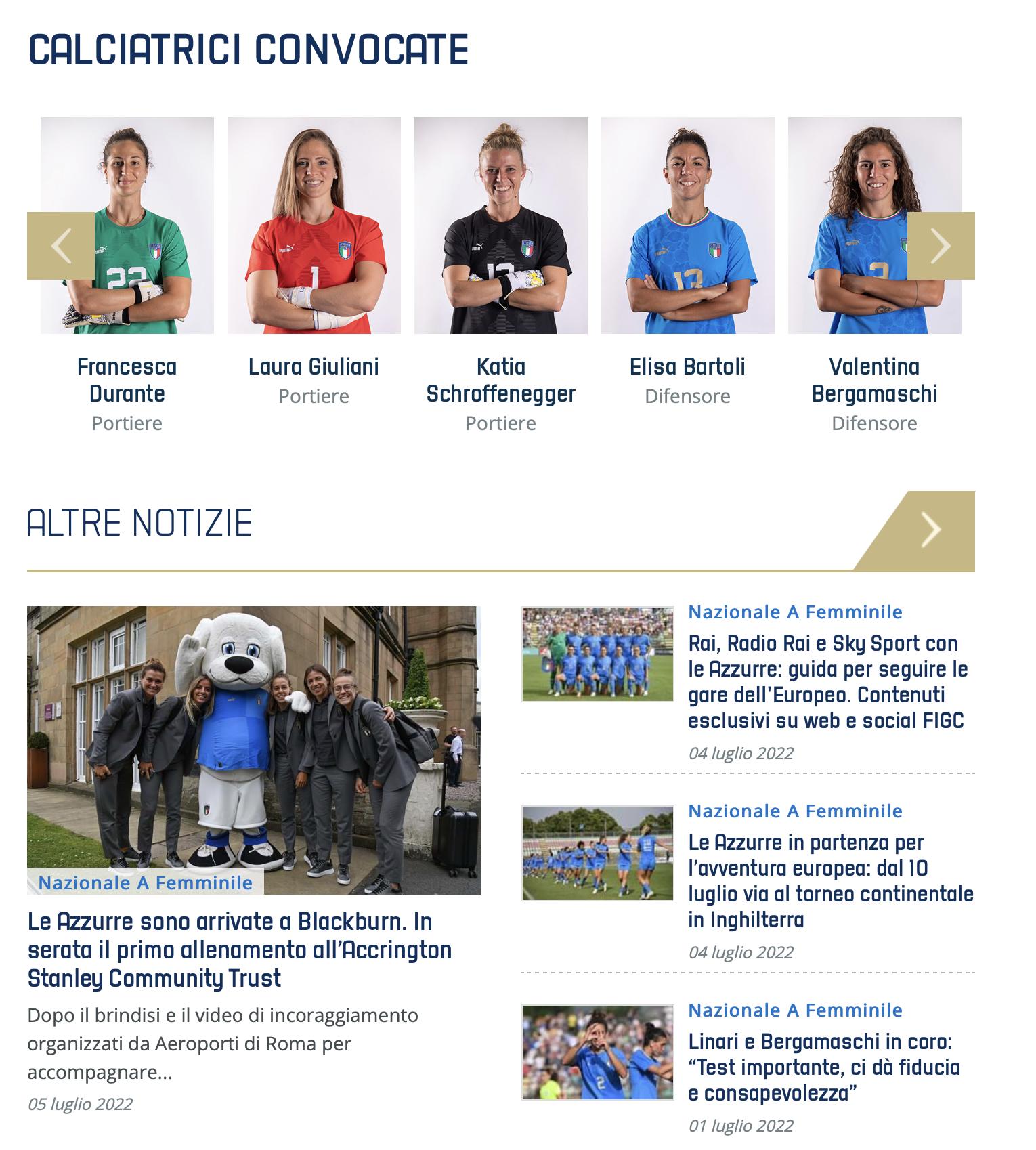 Dopo le emozioni del Mondiale 2019, quando milioni di telespettatori si innamorarono delle "Ragazze Mondiali", la Nazionale Femminile sarà impegnata in un Europeo che si annuncia come l’evento sportivo dell’estate 2022 e per l’occasione la FIGC seguirà le Azzurre giorno per giorno, insieme ai principali Media italiani, con una ampia produzione di contenuti esclusivi, per permettere a tutti gli appassionati di vivere il torneo al fianco delle ragazze. Ogni giorno sul sito della FIGC le ultime notizie dal ritiro della squadra e da "Casa Azzurri Inghilterra", con video e foto esclusivi, il match center con le statistiche sulla Nazionale, il live match interattivo, le schede delle calciatrici convocate con i dati nelle Qualificazioni, nella Fase Finale e nella Serie A 2021-22. E ancora le principali informazioni sulle avversarie e gli approfondimenti sulla storia delle Azzurre e il loro cammino nell’Europeo.