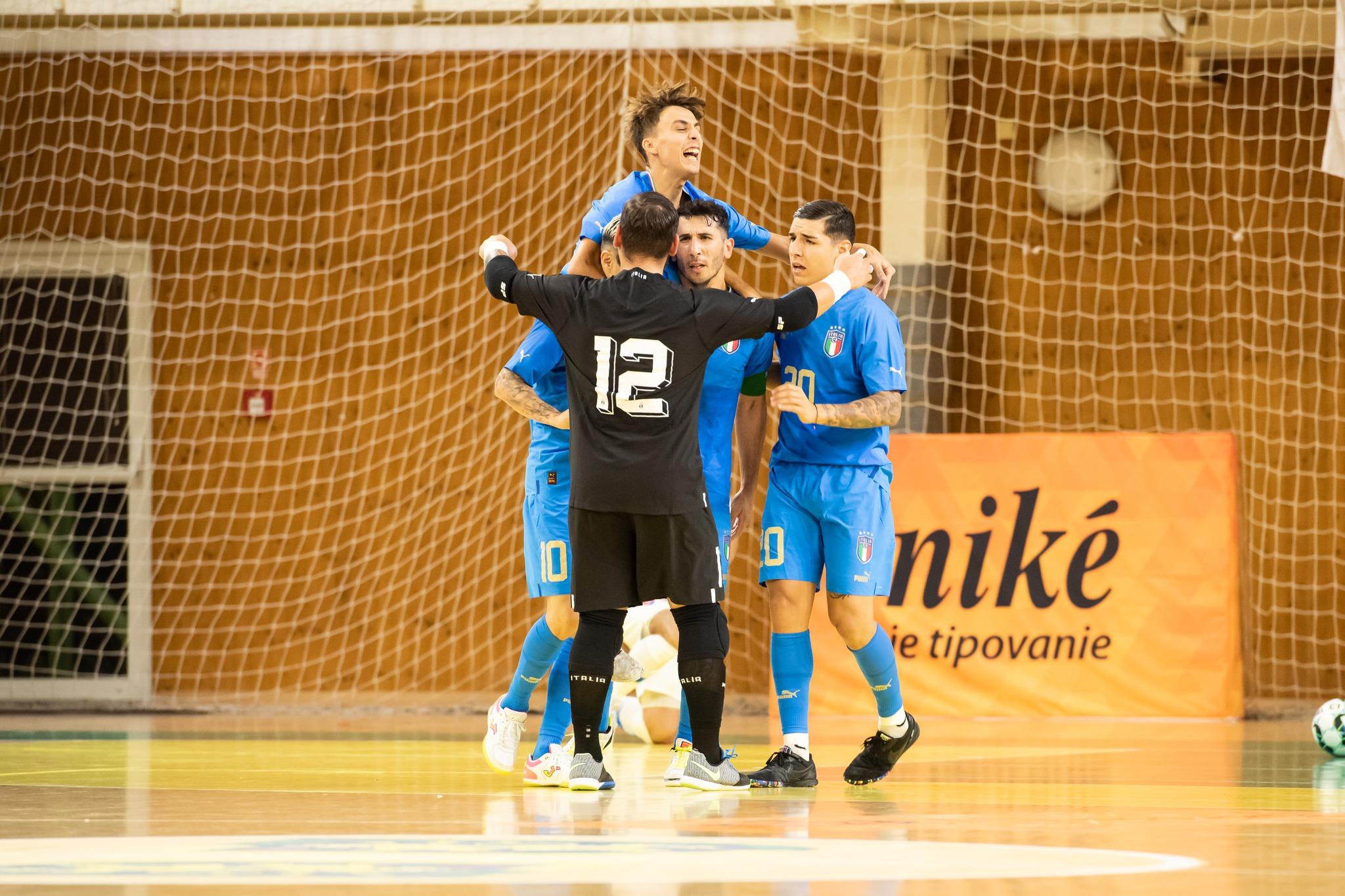 La partita. La gara è accesa, l’avversario è di alto livello, avendo confermato per dieci quattordicesimi il roster dell’ultima rassegna continentale – senza dimenticare che a differenza degli Azzurri la Slovacchia aveva superato il girone di Euro ’22, accedendo ai Quarti di finale – ed essendo squadra esperta e molto fisica. Gli Azzurri, però, hanno il merito di sbloccare la sfida con Cutrupi al sedicesimo: il giocatore dell’Olimpus Roma, perfettamente imbeccato da Merlim, realizza l’1-0, che è anche il suo primo gol assoluto con la maglia dell'Italia. Nel secondo tempo Motta (tre gol in due partite per il calciatore del Cartagena) raddoppia dopo neanche tre giri di lancette: da segnalare è l’ennesimo assist del Mago Merlim. Gli Azzurri tengono botta, anche grazie a un Bellobuono super fra i pali, scappando 3-0 quando a metà frazione Karpiak si fa autogol su tiro di Lo Cicero. Musumeci e compagni resistono nel finale all’assalto contro il portiere di movimento dei padroni di casa. A due minuti dalla fine per gli slovacchi segna Kyjovský, ma non cambia il finale.