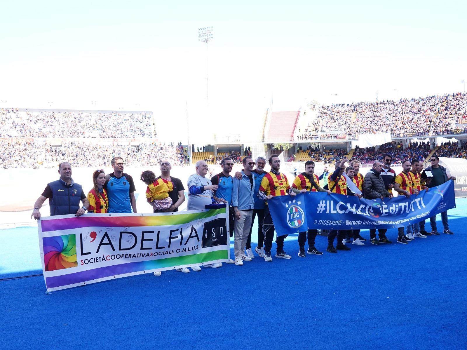 Giornata di festa, per l'Adelfia Lecce, club 'storico' della Divisione Calcio Paralimpico e Sperimentale, che un paio di settimane or sono si è guadagnato la qualificazione alla Fase nazionale di Tirrenia vincendo la Finale della Puglia (Secondo Livello). Per celebrare l'evento, e cementare un rapporto di affettuosa collaborazione che va avanti da parecchi anni, l'Unione Sportiva Lecce - che milita in Serie A - ha invitato la squadra gemellata allo stadio 'Via del Mare' per la partita disputata sabato 27 aprile contro il Monza.