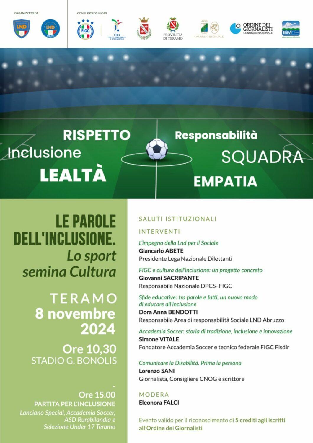 'Le Parole dell’inclusione. Lo Sport semina Cultura': questo il titolo dell'evento che si è svolto oggi a allo stadio Bonolis di Teramo. Un incontro organizzato dalla LND Abruzzo, insieme DCPS della FIGC, al Comune, all'Ordine dei Giornalisti d’Abruzzo e al consorzio locale BIM. Il tema centrale - partendo dal presupposto che il calcio possa anche essere strumento educativo e di integrazione - è stato appunto quello della comunicazione in relazione alla disabilità.