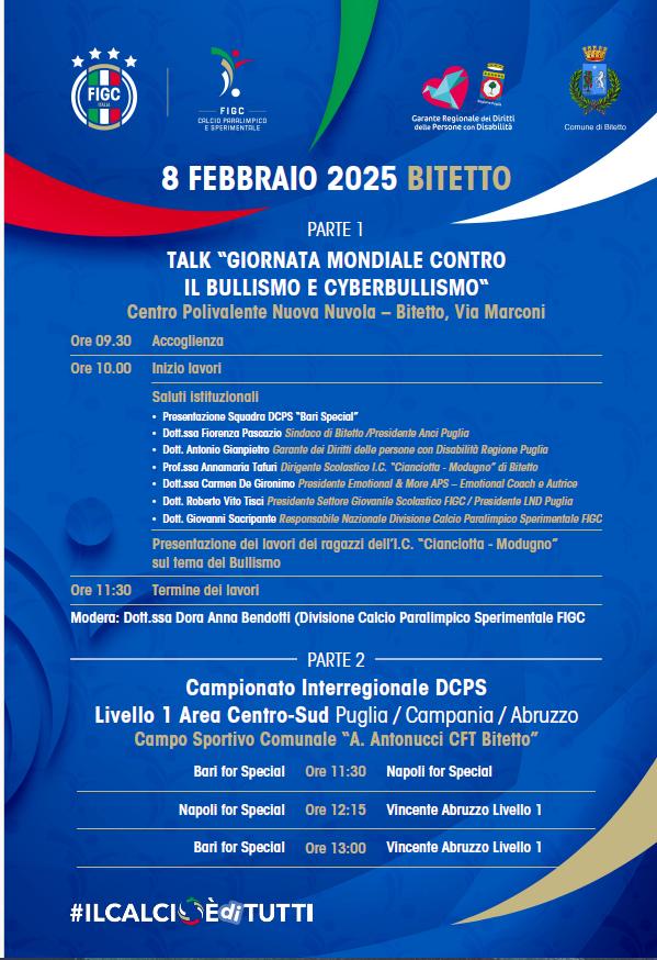 Ci saranno, tra gli altri, il sindaco di Bitetto, Fiorenza Pascazio, il Garante dei Diritti delle persone con Disabilità per la Regione Puglia, Antonio Gianpietro, il presidente del Settore Giovanile Scolastico della FIGC (e presidente della Lega Nazionale Dilettanti Puglia), Roberto Vito Tisci, e il responsabile nazionale della Divisione Calcio Paralimpico Sperimentale della FIGC, Giovanni Sacripante.