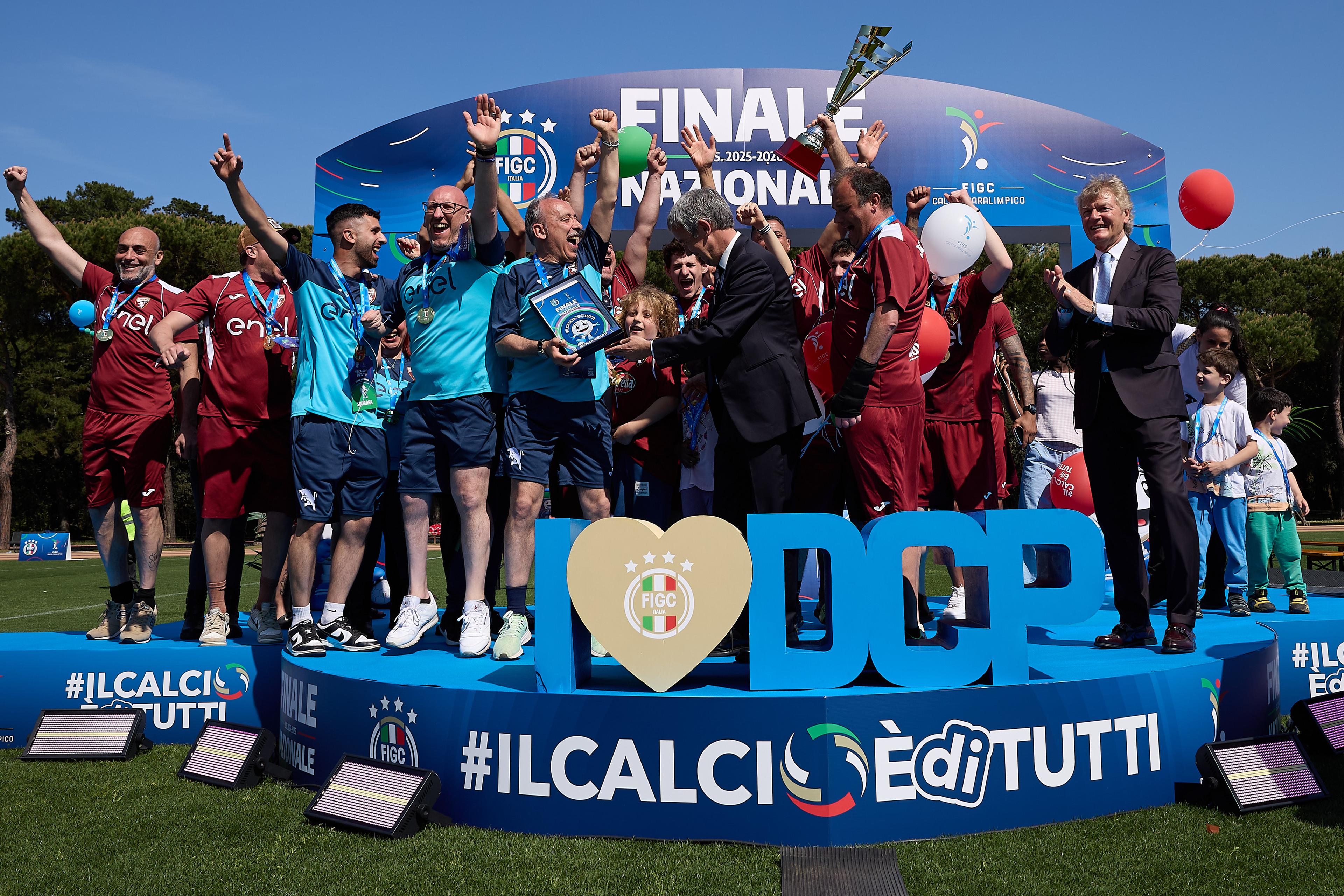Un trionfo granata in una giornata di sorrisi e abbracci: il Torino festeggia il proprio successo alla Finale Nazionale della Divisione Calcio Paralimpico e si laurea così campione d’Italia di primo livello. Nell’assolata mattinata di Tirrenia la squadra piemontese ha inserito il proprio nome - per quanto riguarda il primo dei tre livelli riservati ai calciatori con disabilità cognitivo-relazionali - nell’albo d’oro della manifestazione organizzata dalla DCP. Quest’anno il Centro di Preparazione Olimpica ha infatti ospitato l’ultimo atto della stagione per quanto riguarda il primo livello, mentre per gli altri due l’appuntamento sarà a Coverciano, nel fine settimana del 16 e 17 maggio.