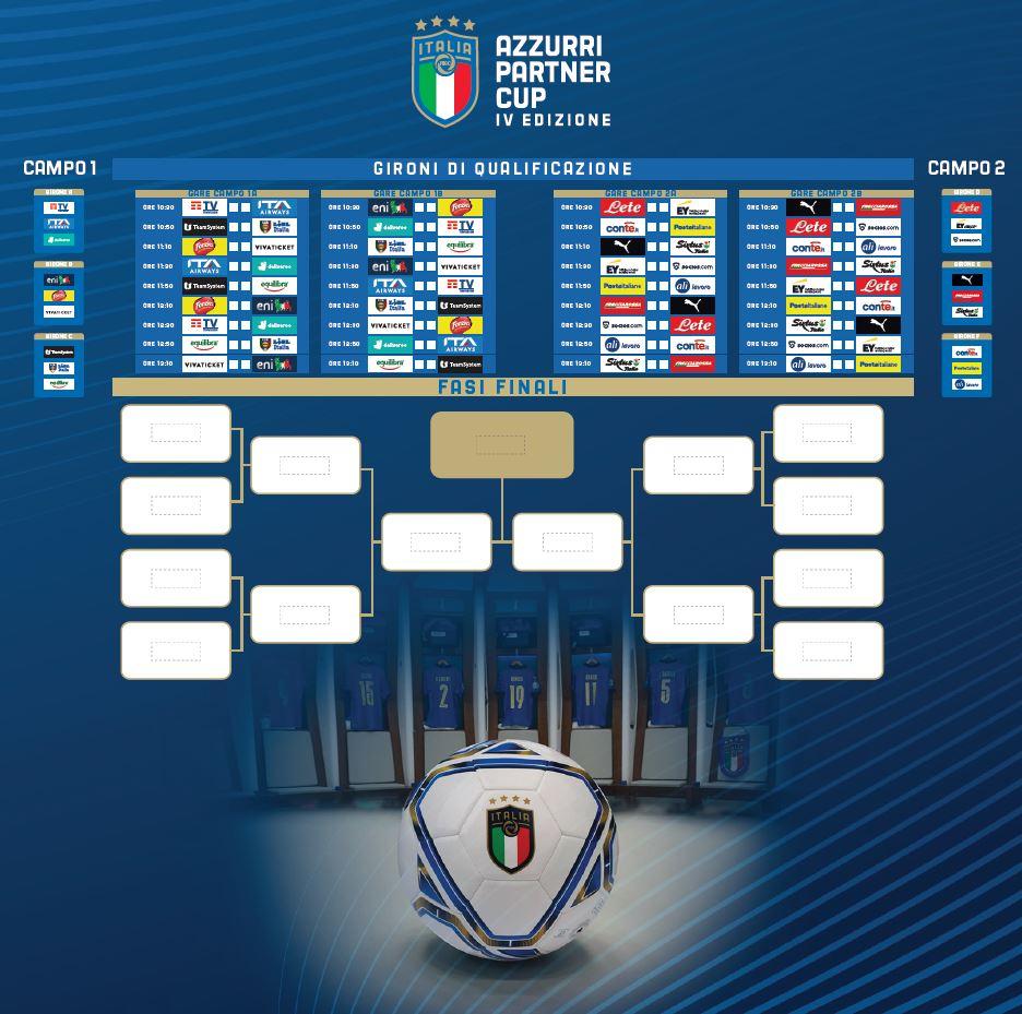 Il torneo. Le 18 squadre sono state suddivise in 6 gironi da 3 e si affronteranno nella mattinata di sabato in gare di andata e ritorno per definire la griglia delle sfide a eliminazione diretta: le prime classificate di ogni girone, insieme alle due migliori seconde, si affronteranno infatti nel pomeriggio dai quarti alla finale, che chiuderà la giornata. Le partite del girone, quarti e semifinali dureranno 15’ (un tempo unico), mentre la finale 30’ (due tempi da 15’). In campo le formazioni di Puma, Tim, Eni, Poste Italiane, Lete, Lidl, Sixtus e le novità Teamsystem, Deliveroo, Socios.com, Trenitalia, Fonzies, Equilibra, Conte.it, Ali Lavoro, Ey, Ita, Vivaticket, alla loro prima partecipazione alla ‘Azzurri Partner Cup’. Le 18 squadre proveranno a insidiare il primato di Poste Italiane, che nelle ultime due edizioni disputate (2018 e 2019) ha vinto il torneo, battendo in entrambi i casi in finale la squadra di Fiat, che a sua volta si era imposta all’esordio del torneo nel 2017.