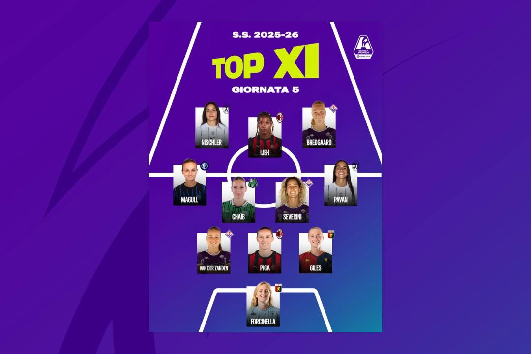La Fiorentina, nell’anticipo di venerdì sera al Viola Park, è stata capace di infliggere il primo ko stagionale alla Roma, che aveva invece vinto tutte le prime quattro partite. Un risultato, quello della squadra di Pablo Piñones-Arce, che porta tre calciatrici viola nella Top 11 della settimana: Ilse van der Zanden in difesa, Emma Severini a centrocampo e Sofie Bredgaard in attacco. Due calciatrici a testa per Genoa (Forcinella e Giles), Milan (Piga e Ijeh) e Como Women (Pavan e Nischler).