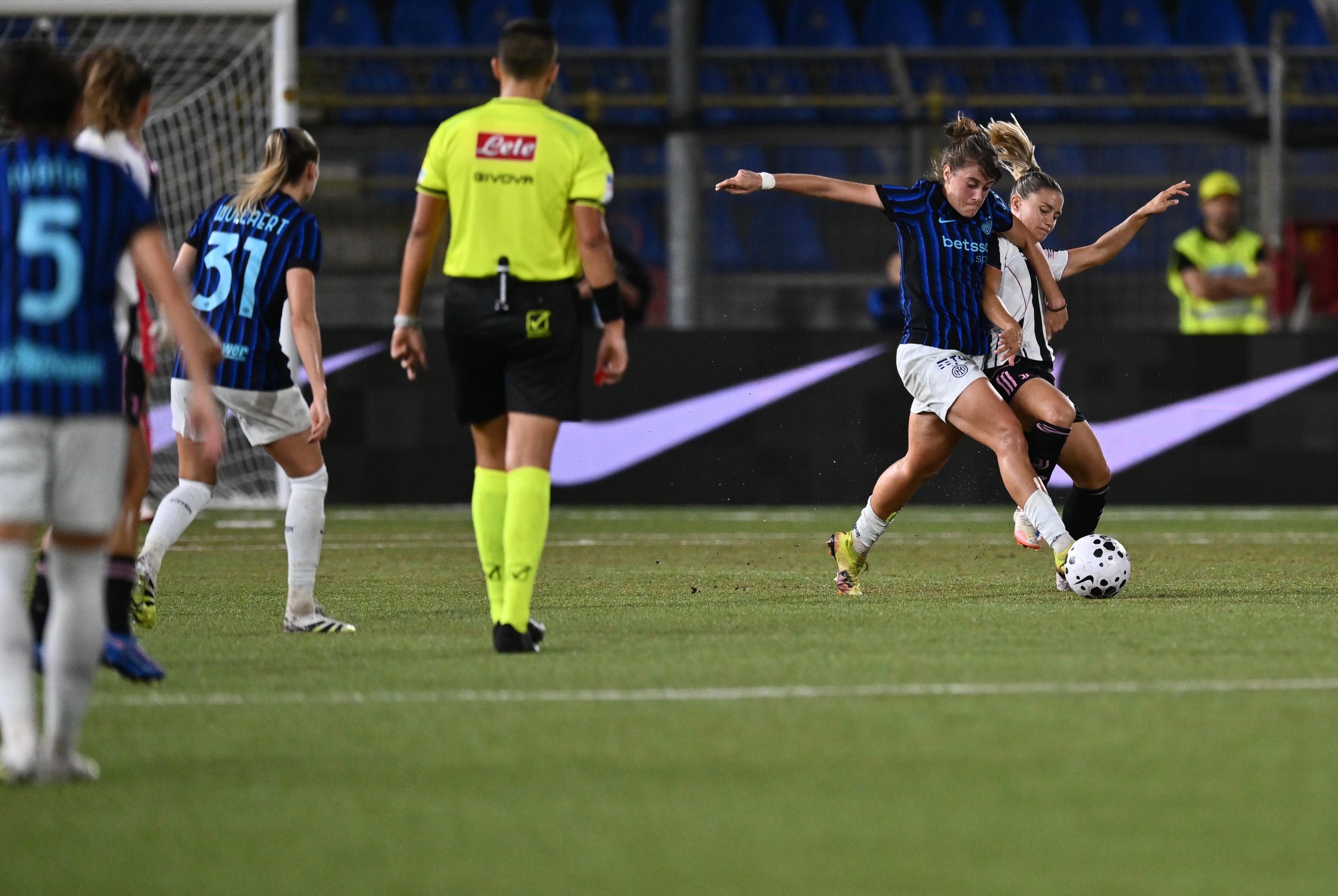 LA PARTITA. Il 23° derby d'Italia della storia si accende al minuto 2 con la Juventus pericolosa su punizione: Brighton piazza un cross teso ma Stolen-Godo colpisce male. L’Inter risponde dopo una manciata di secondi con Wullaert, che riceve palla da una rimessa laterale, si gira bene nell’area avversaria e costringe la retroguardia bianconera a murarla in angolo. Dopo la chance della squadra di Canzi al 2’, crescono le nerazzurre, che si fanno vedere dalle parti di de Jong con il duo Bartoli-Tomasevic e poi con l’ex Glionna. Al 13’ infatti, la classe ’99 raccoglie l’ottimo spunto di Tomasevic sulla corsia di sinistra e con un destro a giro lambisce il palo. I ritmi si alzano in fretta e al minuto 18 la combinazione Bonansea-Beccari non va a buon fine solo grazie al prodigioso intervento in scivolata di Bartoli, che impedisce alla 2004 di concludere in porta. Intorno alla mezzora la Juventus sfiora il vantaggio due volte: prima con Tatiana Pinto (traversone morbido deviato in corner da Runarsdottir) e poi con Carbonell, che scheggia la traversa nel tentativo di crossare in mezzo il pallone. Le occasioni iniziano a essere tante per le bianconere, e al 45’ il parziale si sblocca: punizione precisa di Brighton e incornata vincente dell’ex Inter Cambiaghi, che non esulta ma firma un gol pesantissimo, con cui si chiude la prima frazione.