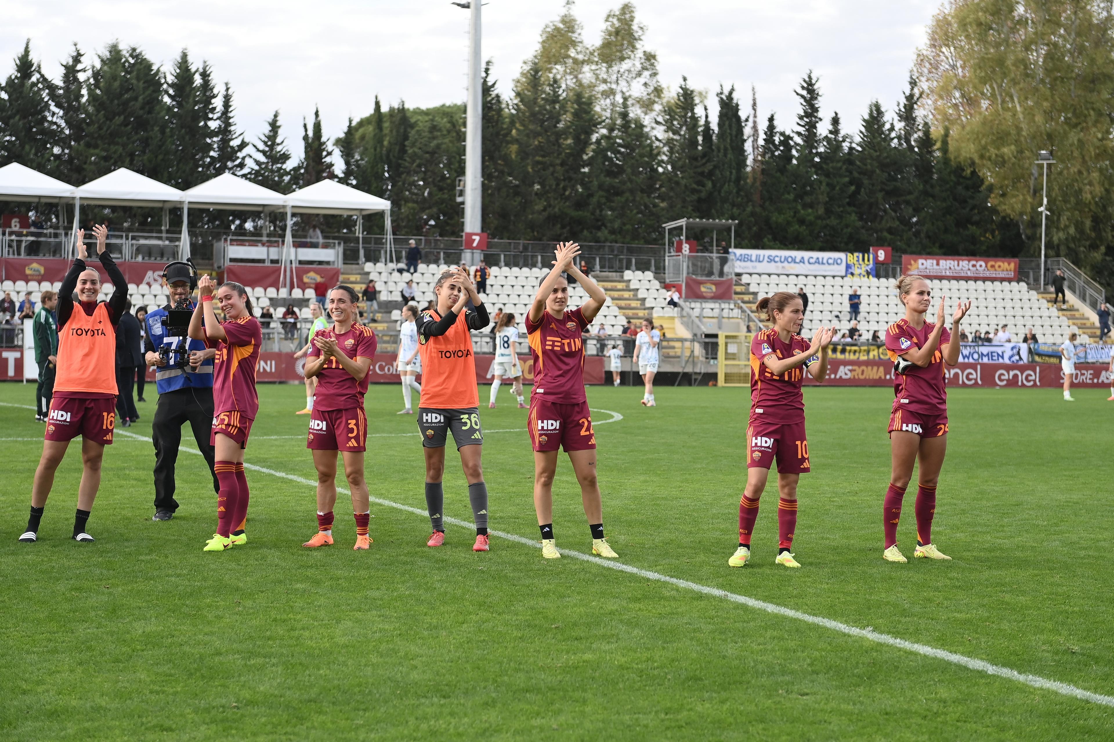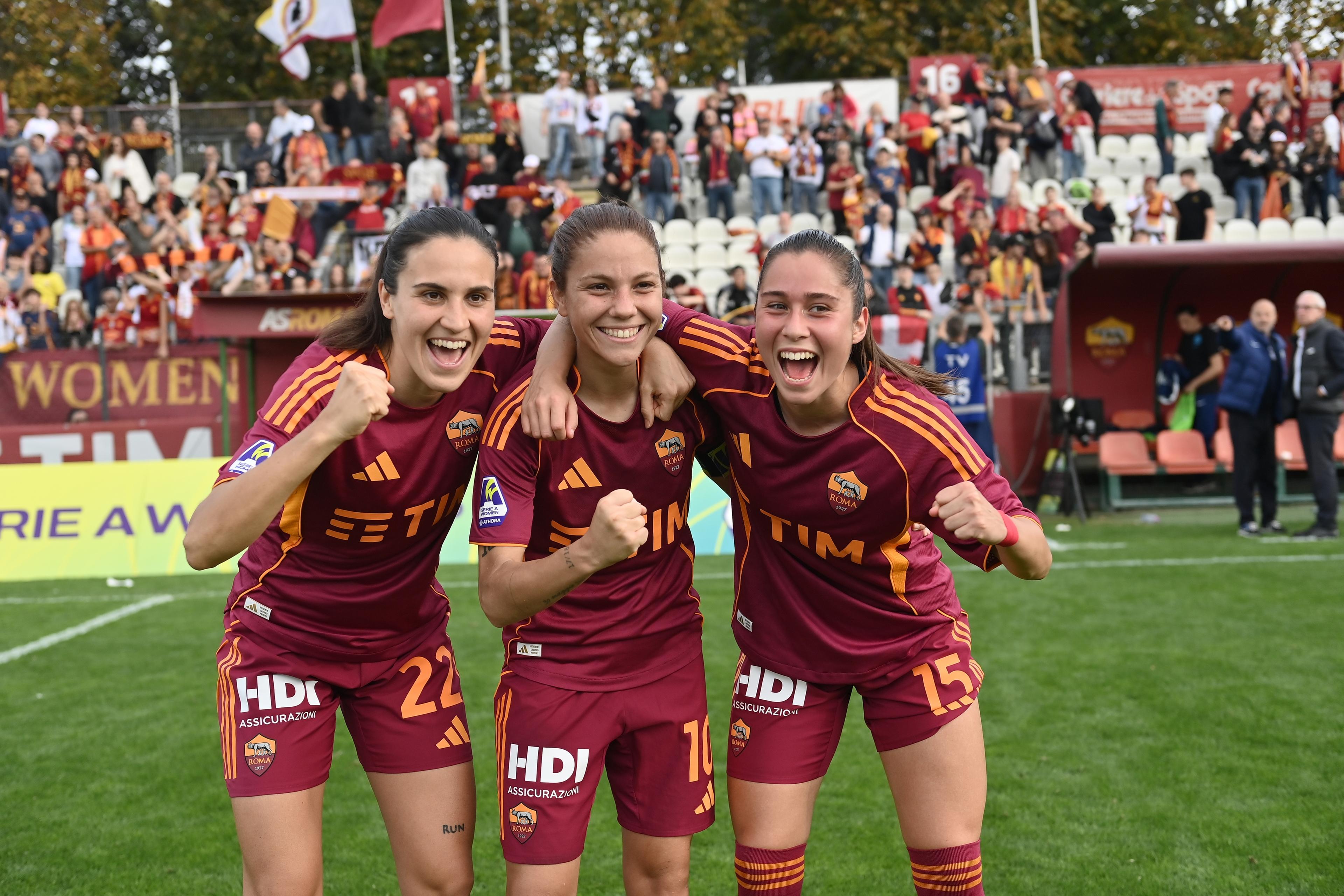 ROMA-INTER 3-0. La Roma non sbaglia neanche con l’Inter e si conferma a pieno titolo la legittima proprietaria della testa della classifica, con quattro vittorie nelle prime quattro. Nella sfida del Tre Fontane, bastano 3 minuti e 24 secondi alle padrone di casa per portarsi avanti nel punteggio: cross di Kühl e diagonale vincente dell’ex nerazzurra Pandini, che sigla la sua terza marcatura stagionale tra tutte le competizioni (le stesse totalizzate nella scorsa annata, in 25 match). Le giallorosse sfiorano il raddoppio sempre con Pandini al 26’, mentre tra le nerazzurre sono Magull e l’ex Roma Glionna le più pericolose (traversa al 50’ per la classe ‘99). Tuttavia, il punteggio cambia a favore delle capitoline al minuto 67’, con un’altra ex della gara: è infatti la subentrata Dragoni a segnare il 2-0 per le undici di Rossettini, lanciata in contropiede da Viens. La squadra di Piovani fatica a trovare gli spazi e nel finale, dopo un’altra occasione per Glionna respinta da Baldi, incassa il tris di Giugliano, che mette il punto esclamativo sullo scontro diretto tra giallorosse e nerazzurre, con il Biscione a -7 dal primo posto.