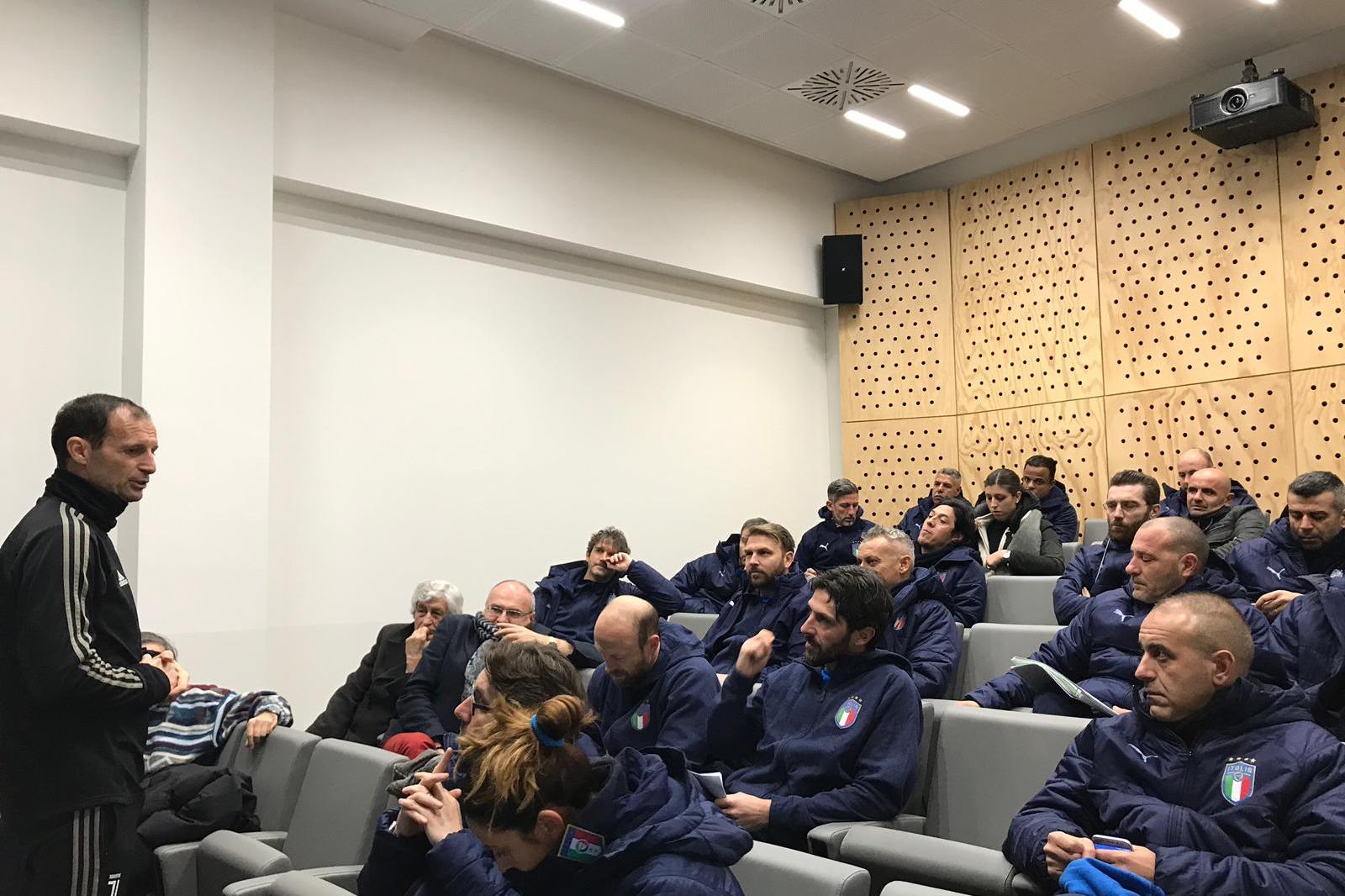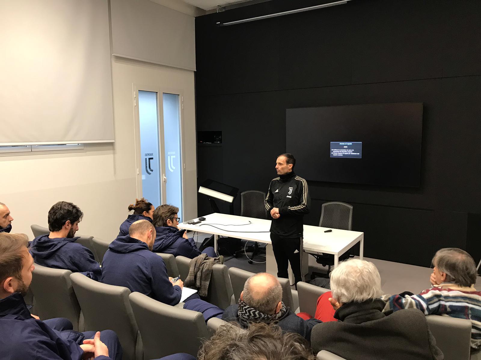 Sul campo i corsisti del Master hanno potuto osservare con attenzione una seduta di allenamento della prima squadra juventina e poi, dopo i saluti del vicepresidente bianconero Pavel Nedved, è stato direttamente Massimiliano Allegri – premiato lo scorso novembre dal Settore Tecnico quale migliore allenatore della scorsa stagione di Serie A – a spiegare in aula le sue teorie di gioco.