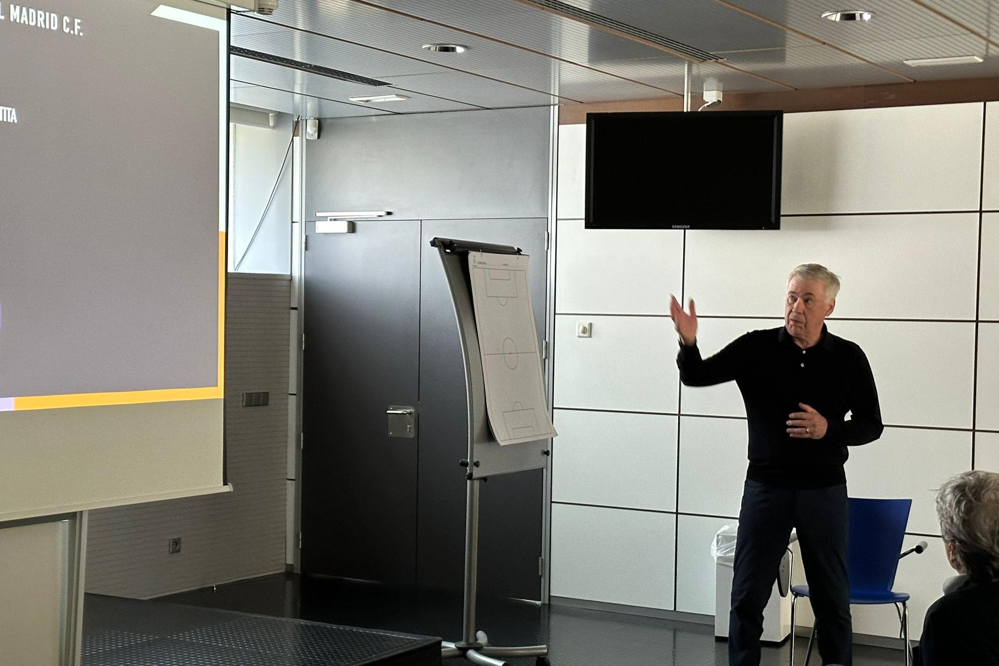 Accompagnati dal segretario del Settore Tecnico, Paolo Piani, e dai docenti della Scuola Allenatori, Mario Beretta e Ferretto Ferretti, i corsisti questa mattina hanno potuto seguire in aula gli interventi a cura di Carlo Ancelotti, del suo vice allenatore, Davide Ancelotti, dell’assistente tecnico Francesco Mauri e del preparatore atletico Antonio Pintus. Domani, nell’ultimo dei due giorni di stage, gli allievi potranno seguire dal vivo la seduta di allenamento del Real Madrid, per vedere in prima persona le metodologie adottate sul campo.