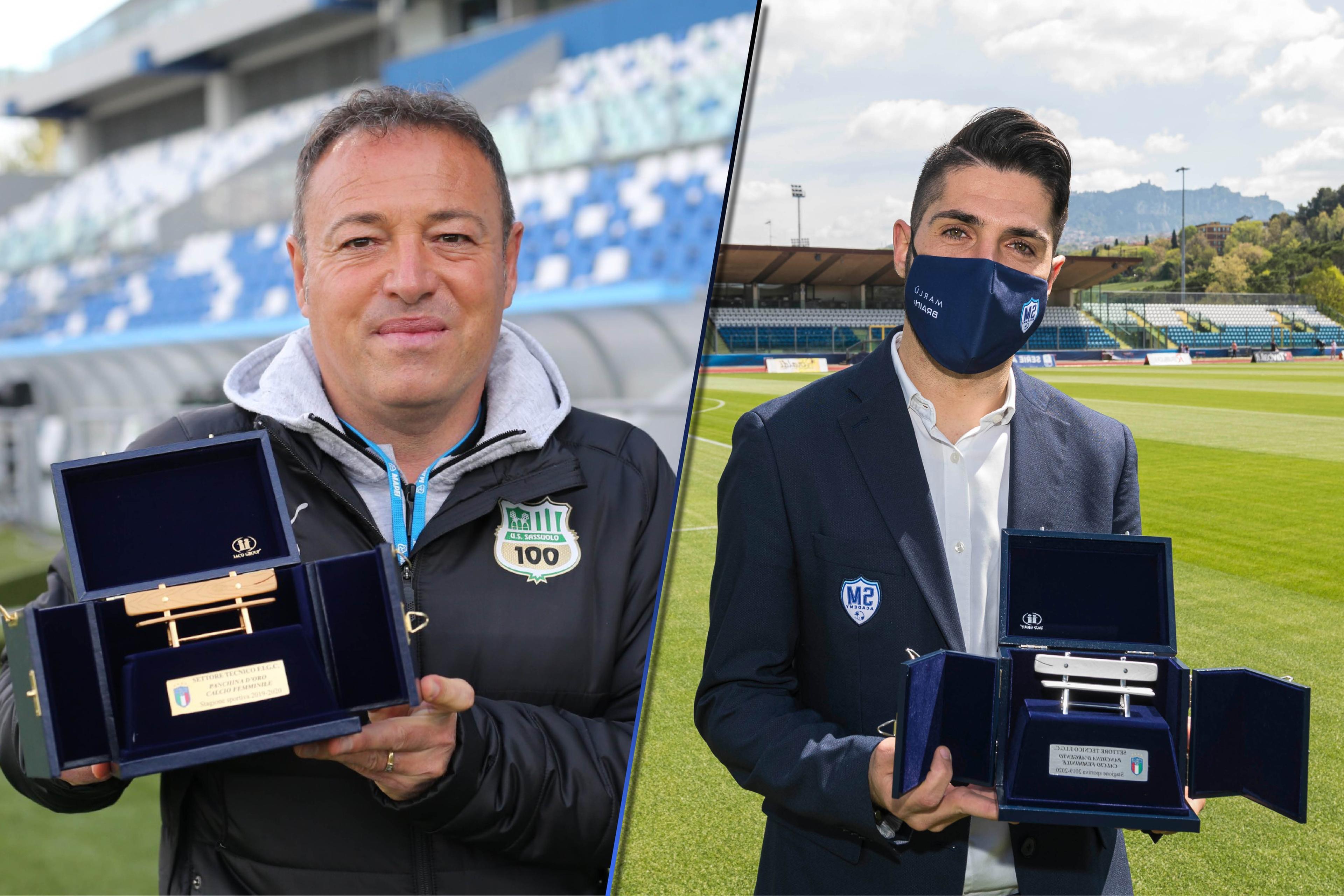 Una giornata intensa, vissuta tra San Marino e Reggio Emilia, per continuare nel proprio ‘tour’ in giro per la penisola italiana, per consegnare agli allenatori vincitori i riconoscimenti conquistati per essere stati votati dai propri colleghi quali migliori allenatori della scorsa stagione nelle rispettive categorie. Nella giornata di sabato il presidente del Settore Tecnico, Demetrio Albertini - dopo essere stato a Zingonia per premiare Gasperini e a Benevento per omaggiare Filippo Inzaghi - ha virato sull’Emilia Romagna e su San Marino, per celebrare i migliori allenatori del calcio femminile della scorsa stagione: nelle votazioni avvenute on-line nelle scorse settimane, infatti, i migliori tecnici della Serie A TIMVISION e della Serie B femminile sono risultati essere Gianpiero Piovani del Sassuolo e Alain Conte, tecnico che ha condotto la San Marino Academy alla promozione nel massimo campionato nazionale. Così Albertini si è recato personalmente, prima al San Marino Stadium, cornice dell’allenamento delle Titane, per consegnare la Panchina d’argento al tecnico Alain Conte, quindi allo stadio Città del Tricolore di Reggio Emilia, prima di Sassuolo-Fiorentina (maschile), per consegnare la Panchina d’oro all’allenatore neroverde Gianpiero Piovani.