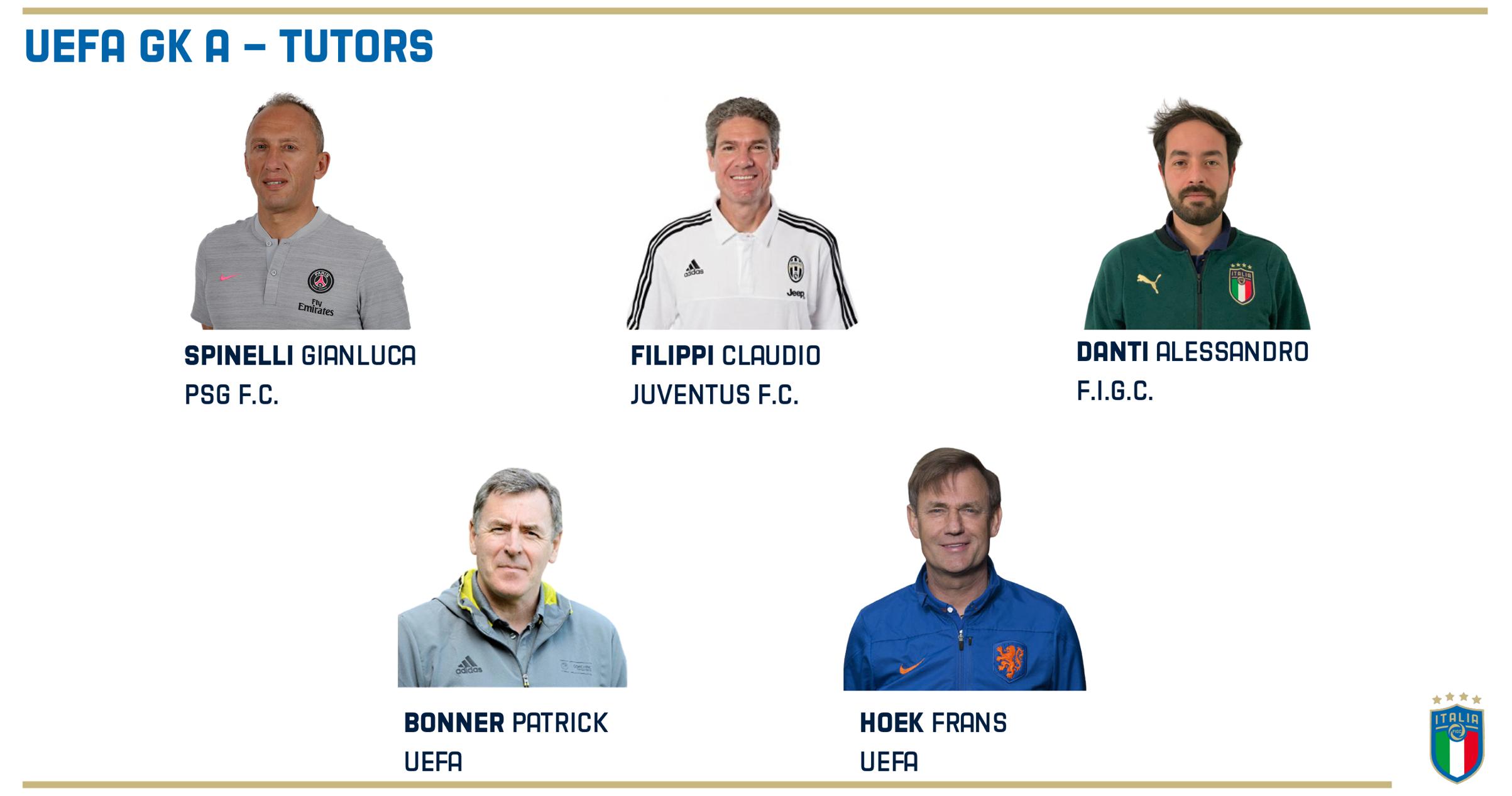 Questo primo corso pilota sta coinvolgendo gli allenatori dei portieri di tutte le società di Serie A e i tutor che in questo percorso accompagneranno gli allievi – già rinomati professionisti del settore – sono nomi eccellenti della disciplina: l’attuale allenatore dei portieri del Paris Saint Germain ed ex preparatore degli estremi difensori della Nazionale italiana, Gianluca Spinelli; l'allenatore dei portieri della Juventus, Claudio Filippi, oltre al docente del Settore Tecnico, Alessandro Danti. Ad affiancare questi tre tutor sono inoltre presenti due nomi di alto profilo a livello mondiale nella preparazione dei portieri: i tutor UEFA Pat Bonner (portiere dell’Irlanda ai mondiali di Italia ’90) e Frans Hoek, già allenatore dei portieri della Nazionale olandese.