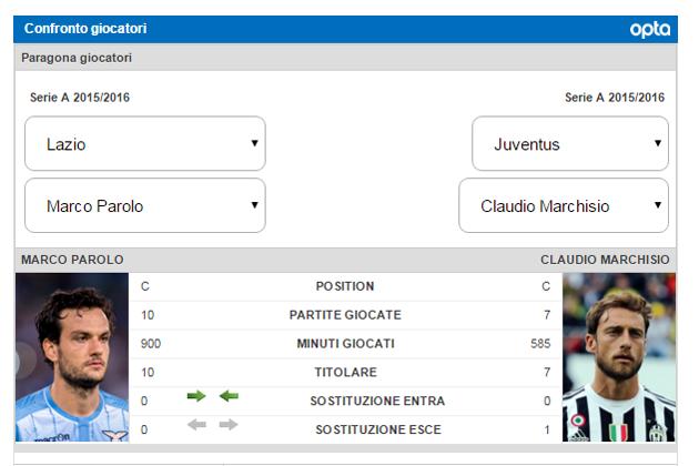 Stasera, fischio d'inizio alle 20.45, Lazio e Juventus scendono in campo allo Stadio Olimpico per la 15^ giornata di Serie A. I biancocelesti cercano il riscatto dopo il ko di Empoli, i bianconeri vanno a caccia della quinta vittoria consecutiva in campionato.Vivo Azzurro gioca il match proponendovi un confronto statistico "Made in Italy" tra Marco Parolo e Claudio Marchisio, analizzando le loro prestazioni in campionato attraverso le statistiche Opta.Il primo dato riguarda l'impiego: Parolo ha collezionato 10 presenze (900 minuti in campo, mai sostituito) contro le 7 di Marchisio (585 minuti), che paga l'infortunio di inizio stagione.Sul fronte dell'impostazione prevale il centrocampista bianconero che, nonostante abbia giocato meno, ha effettuato più passaggi (495 vs 462), con un eccezionale 90,7% di passaggi riusciti a fronte del 79,4% di Parolo.Nella fase di contrasto dell'azione, il biancoceleste partecipa a più duelli in mezzo al campo (103 vs 51) e ne vince di più (53,4% vs 49%). Anche nei contrasti aerei Parolo è più attivo (40 vs 10) e ne esce più spesso vincitore (65% vs 40%). Identico il dato dei palloni intercettati (19), ma il giocatore della Lazio conferma la vocazione più difensiva avendo respinto 18 palloni contro i 5 dello juventino.Le statistiche della fase offensiva lasciano emergere le doti di incursore di Parolo, più presente nella finalizzazione rispetto a Marchisio, che quest'anno ha compiti prevalentemente di impostazione. È così che, oltre che nel dato dei gol (1 vs 0), il biancoceleste la spunta nei tiri totali (12 vs 8), nei tiri nello specchio (7 vs 2) e nelle occasioni create (12 vs 6).A livello disciplinare, infine, Parolo ha commesso più falli (12 vs 9) e ne ha subiti di più (8 vs 5), mentre Marchisio ha accumulato più cartellini: 3 ammonizioni contro un solo giallo rimediato dal biancoceleste.Confronta tutti i calciatori e le squadre della Serie A con il nostro widget centre