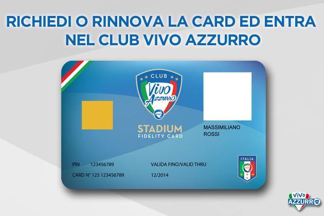Si comunica ai possessori della Card Vivo Azzurro che è possibile rinnovare gratuitamente l'iscrizione al Club ufficiale dei Tifosi delle Nazionali e del Calcio italiano, registrandosi al sito e accedendo all'area utente (clicca qui).I non iscritti al Club, che fosse interessati a richiedere la Card e usufruire dei vantaggi associati, dovranno registrarsi al sito e seguire le istruzioni presenti nell'apposita sezione (clicca qui)