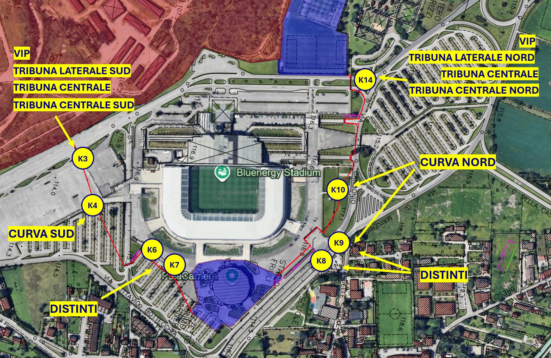 Gli acquirenti dei biglietti dei settori Tribuna Centrale, Vip, Tribuna Centrale Nord, Tribuna Laterale Nord dovranno accedere all’impianto esclusivamente attraverso i varchi K14.