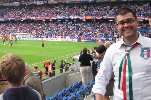 "A poche ore dai quarti di finale un drappello di tifosi azzurri con tanto di maglia e tricolore in pugno entra nella Fan Zone. Si tratta sicuramente di un gruppo di italiani provenienti dalla vicina Germania che sono venuti per il weekend a Poznan, e per l'occasione non si vogliono perdere l'emozione dei quarti di finale.