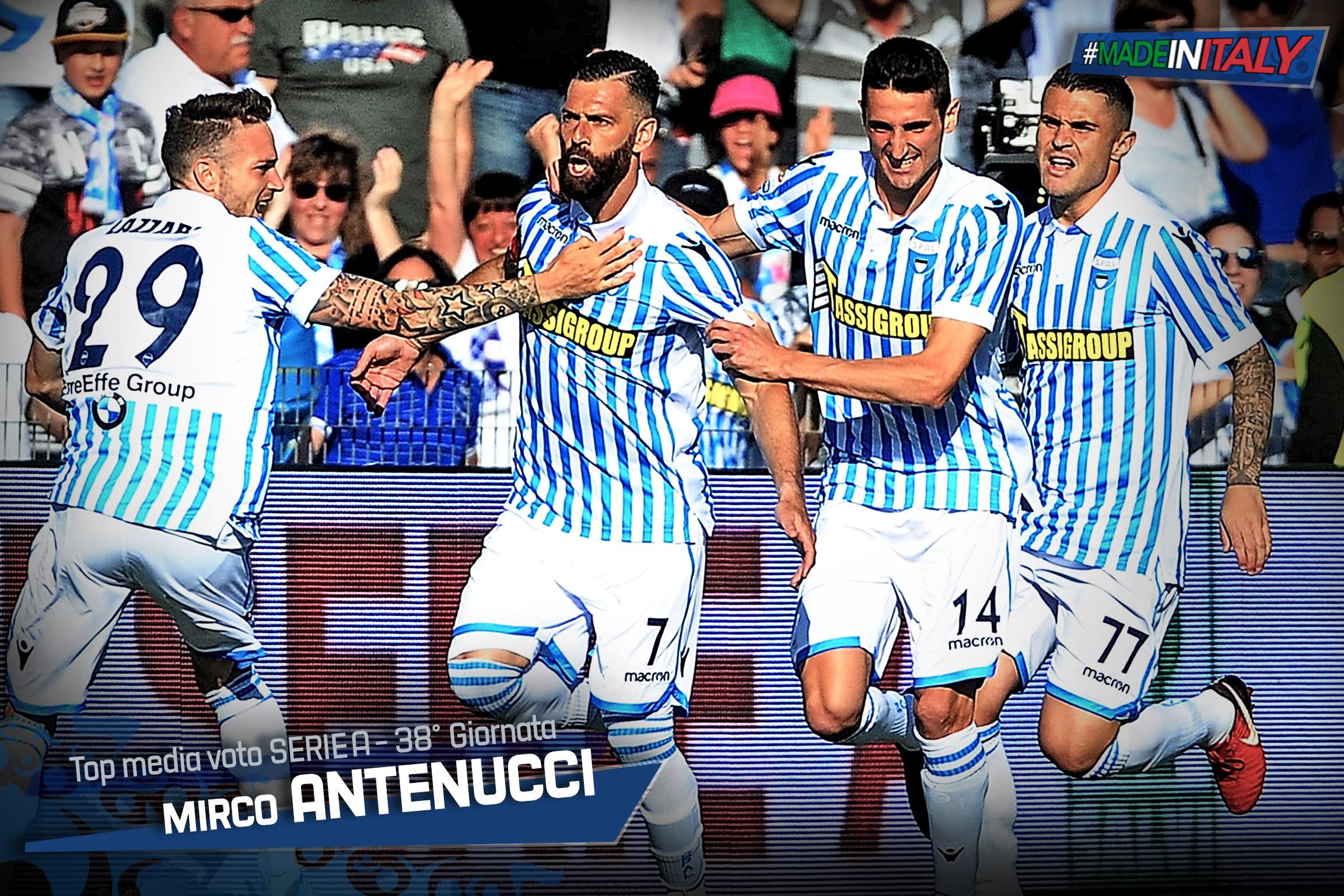 Pubblichiamo le pagelle comparate dei calciatori italiani che hanno ottenuto i voti più alti dalla comparativa dei tre più diffusi quotidiani sportivi del paese (La Gazzetta dello SportCorriere dello Sport e Tuttosport).La classifica della Serie A TIMRisultati e prossimo turno GLI "IN" DEL CAMPIONATO Mirko ANTENUCCI (G 7,5; C 8; T 8,5)     SPAL – Sampdoria 3-1Non possono esserci dubbi sul fatto che sia l’uomo del destino ferrarese, il trascinatore indiscusso verso questa salvezza che resterà ben impressa nella memoria collettiva dei tifosi emiliani. Dal dischetto è glaciale, nella seconda rete perfetto. Non ci sono aggettivi per soppesare il suo apporto alla causa. Patrick CUTRONE (G 7,5; C 8; T 7,5)     Milan – Fiorentina 5-1Doppietta che stende la Viola e lo porta in doppia cifra in campionato, a quota 18 reti stagionali. I due gol sono sintomatici della sua indubitabile attitudine da rapace d’area di rigore. Senza alcun dubbio è la nota più lieta della stagione rossonera. Lorenzo INSIGNE (G 7,5; C 7,5; T 7)     Napoli – Crotone 2-1Come è suo solito, ispira alla perfezione la manovra partenopea con due pregevoli assist per le reti di Milik e Callejon. Chiude in bellezza una stagione fatta di moltissimi acuti, contraddistinta da una continuità ad alti livelli davvero encomiabile.