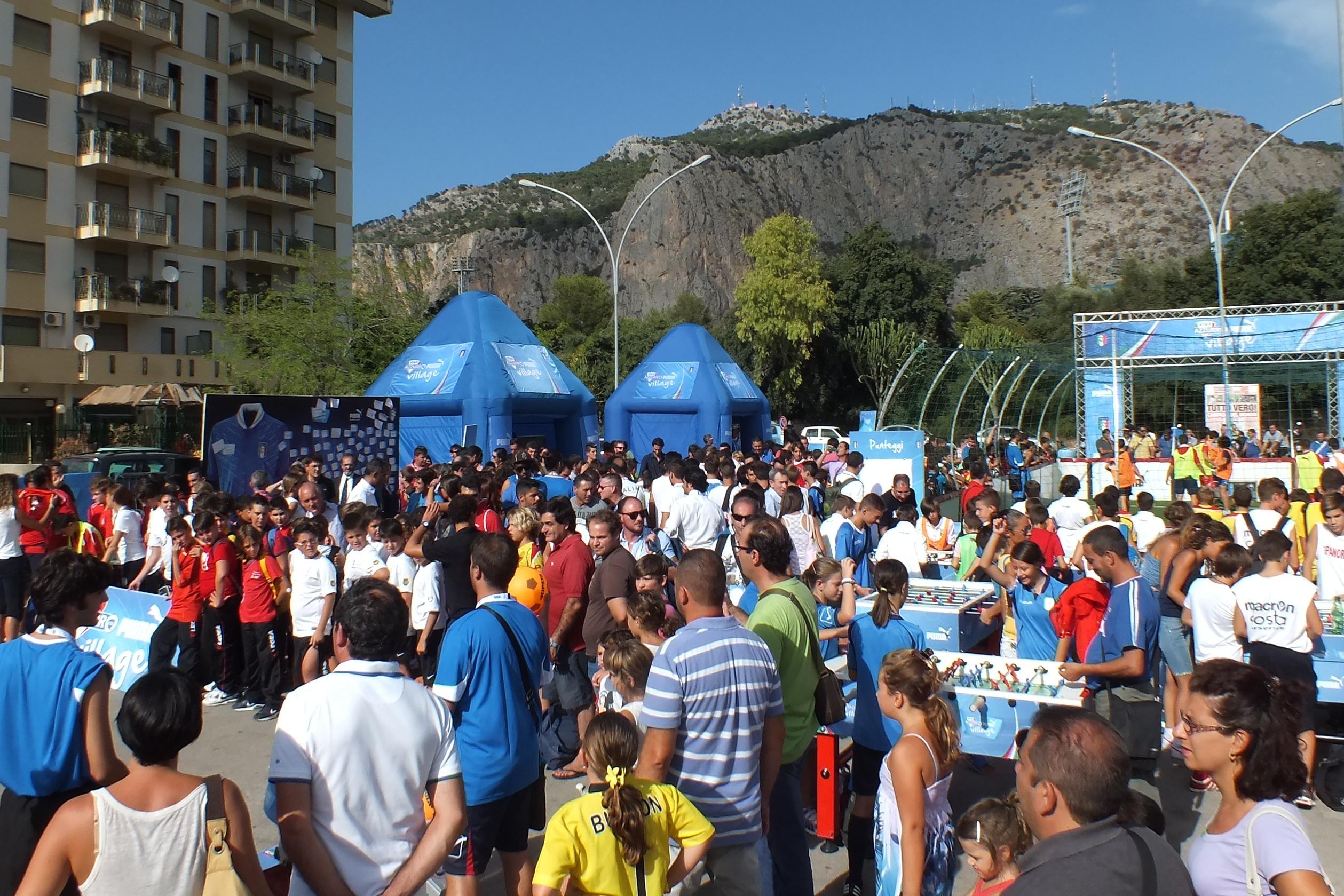 Oggi allo stadio "Renzo Barbera" di Palermo andrà in scena Italia-Azerbaigian, gara di qualificazione all'Europeo 2016.Per celebrare l'evento sportivo che vedrà coinvolta la Nazionale di Antonio Conte, il capoluogo siciliano ospiterà il Vivo Azzurro Puma Village, presso Piazza Papa Giovanni Paolo II (già Piazza Alcide De Gasperi), adiacente all'ingresso principale dello stadio. Il villaggio azzurro, organizzato da FIGC, in collaborazione con lo sponsor tecnico PUMA, il Settore Giovanile e Scolastico e il Comitato Regionale della Sicilia, sarà aperto alle scuole primarie di Palermo invitate, dalle 9.30 alle 12.30, e alle Scuole Calcio, dalle 14.30 alle 19.00 di oggi.I Tifosi azzurri, che si recheranno al "Renzo Barbera" per assistere alla partita della Nazionale, potranno accedere al Vivo Azzurro Puma Village dalle 19.00 fino all'inizio della gara.All'evento è prevista la partecipazione di circa 1.300 bambini degli istituti scolastici di Palermo e delle scuole calcio siciliane (in particolare i giovani appartenenti alle categorie Esordienti e Giovanissimi).I bambini daranno vita al Grassroots Festival, dove verranno coinvolti in attività didattiche - come il contest "No to Racism"- giochi e partitelle, affinchè possano divertirsi liberamente riscoprendo quello che era una volta il calcio giocato al parco o nel cortile sotto casa.All’interno del villaggio saranno allestite aree di gioco e di animazione, per far vivere ai partecipanti l’emozione e il sogno della Maglia Azzurra.Oltre ai consueti percorsi interattivi, i bambini avranno modo di cimentarsi nella telecronaca delle azioni di gioco dei loro idoli azzurri, utilizzando strumenti professionali, e imparare l'Inno d'Italia. Sarà inoltre possibile assistere alla proiezione di filmati emozionali sulla Nazionale e stampare la propria foto digitale con la Maglia Azzurra.Il Vivo Azzurro Puma Village su Google Maps