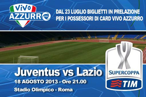 Fino al 26 luglio 2013 i Tifosi già in possesso della Card Vivo Azzurro avranno modo di acquistare in via riservata i biglietti per la gara di Supercoppa Tim 2013 Juventus-Lazio, in programma allo Stadio "Olimpico" di Roma, domenica 18 agosto 2013, con inizio alle ore 21.00.