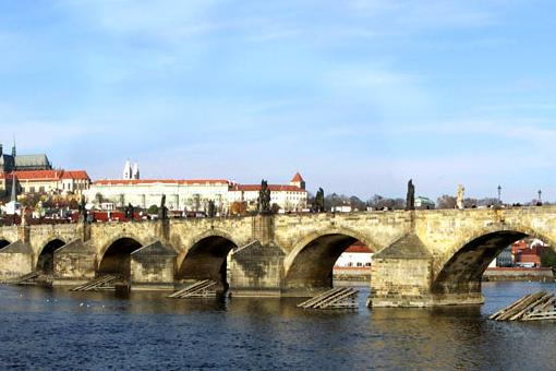 A frastagliare ulteriormente il profilo panoramico di Praga, si ergono le due torri della fortezza Vyšehrad, la più antica sede dei principi boemi, e quelle dell'imperiosa Cattedrale di S. Vito.