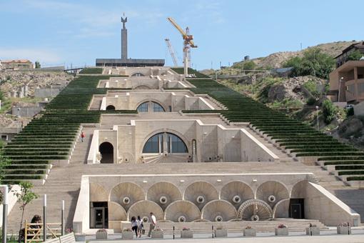 Caratteristici sono anche le scalinate rosee del complesso delle Cascate, simbolo cittadino (in foto), l’imponente Piazza della Repubblica, il monumento dei Martiri del Genocidio, le rovine di Erebuni, i monasteri e la vista sui 5.137 metri del monte Ararat.