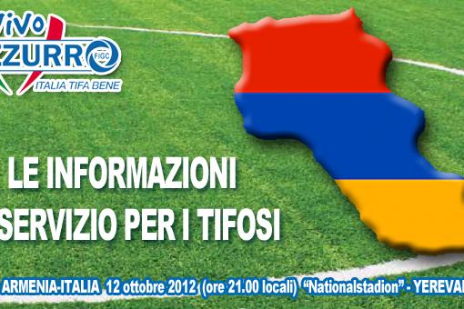 Riportiamo le principali informazioni di servizio utili ai Tifosi Azzurri che intendono recarsi a Yerevan, in Armenia, per assistere ad ARMENIA-ITALIA, gara di qualificazione a FIFA Brasile 2014, che sarà disputata venerdì 12 ottobre 2012 presso il "Nationalstadion", alle ore 21.00 locali (ore 19.00 italiane). Parte delle informazioni riportate sono state prelevate dal sito del Ministero degli Affari Esteri - www.viaggiaresicuri.it - che vi invitiamo a leggere per ulteriori approfondimenti su Yerevan e l’Armenia.